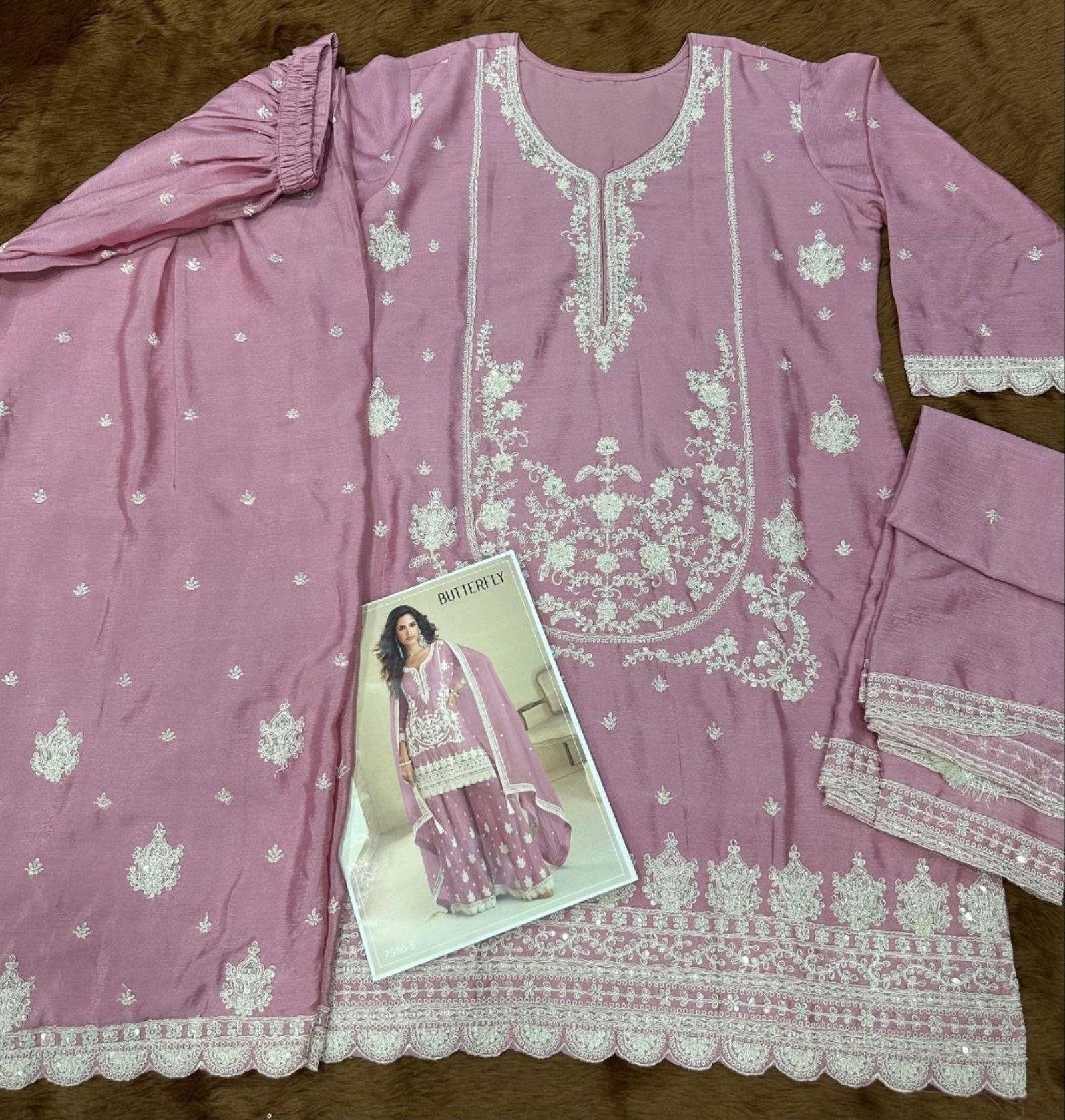 Gulkayra Designer Butterfly Pink Real Chinon Embroidered Palazzo Suit