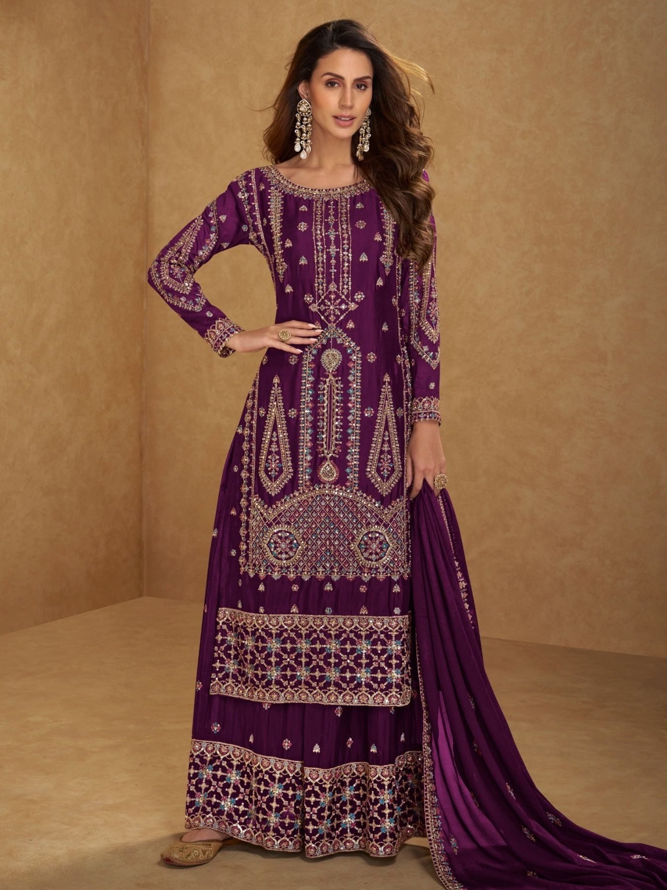 Gulkayra Designer Hirni Chinon Embroidered Salwar Kameez In a Royal Purple.