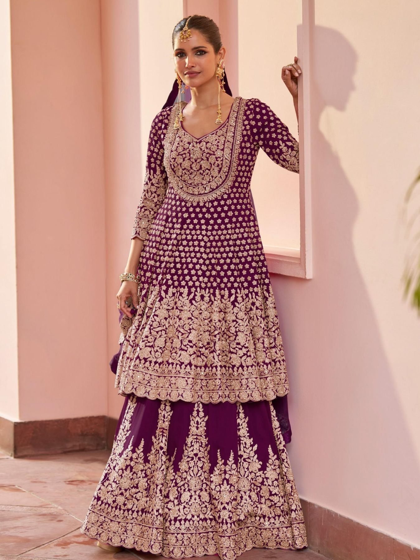 Gulkayra Designer Real Georgette Plum Wine Wedding Festive Lehenga Suit