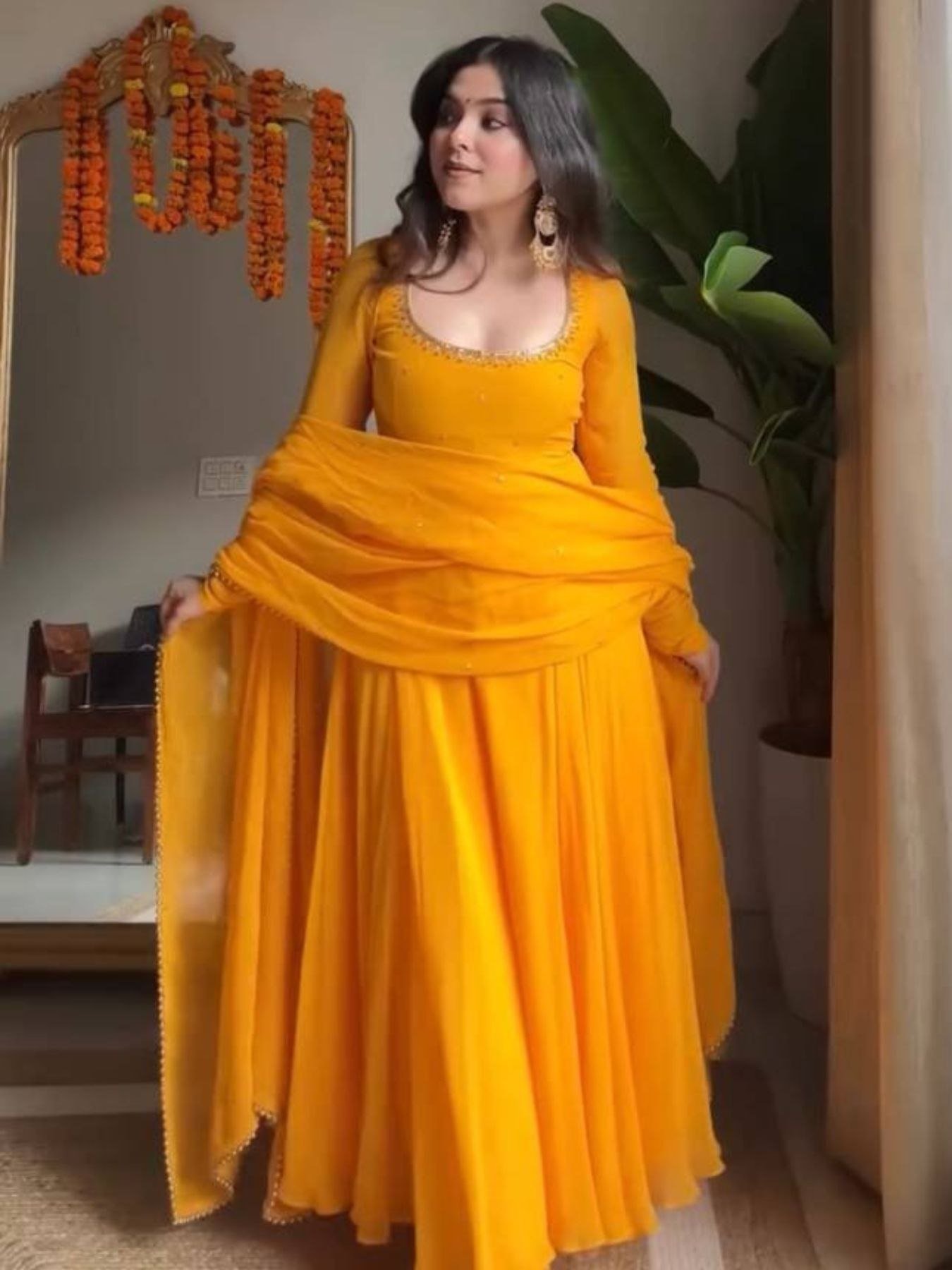 Haldi Special Faux Georgette Handwork Anarkali Set with Cotton Pant Moti Lace Dupatta For Women