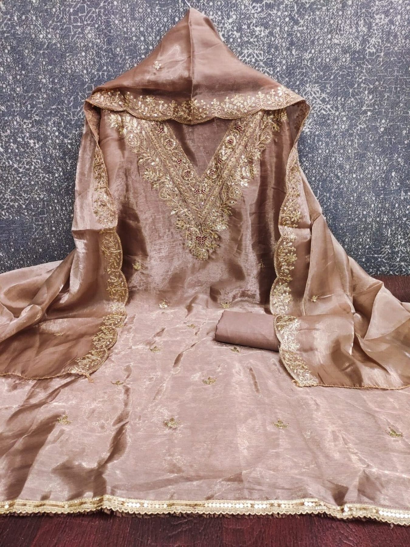 Affordable designer suit material in Zimmi Choo fabric with kodding sequins embroidery, paired with santoon bottom and matching dupatta. Ideal for stitching into stylish ethnic wear.
