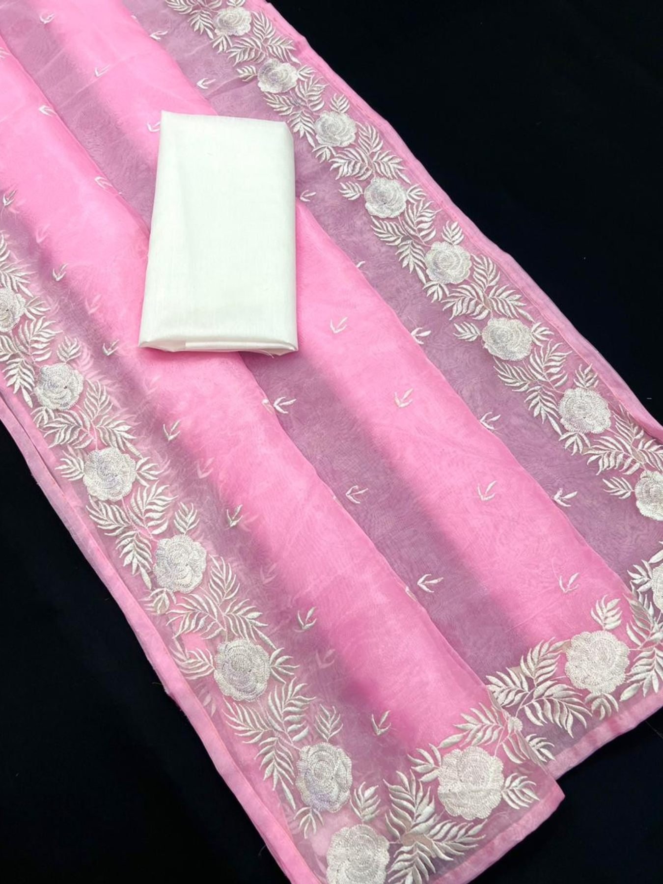Heavy Chikankari Floral Work Pallu Organza Saree