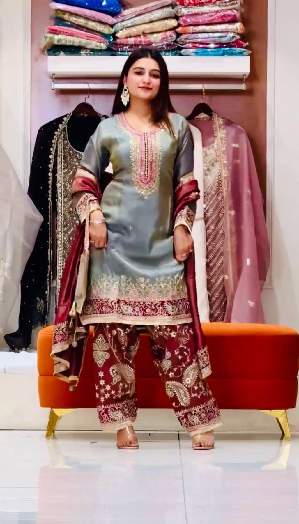 Redefine luxury with this Designer Heavy GMY Silk Embroidered Plazzo Set, crafted to radiate sophistication and style.