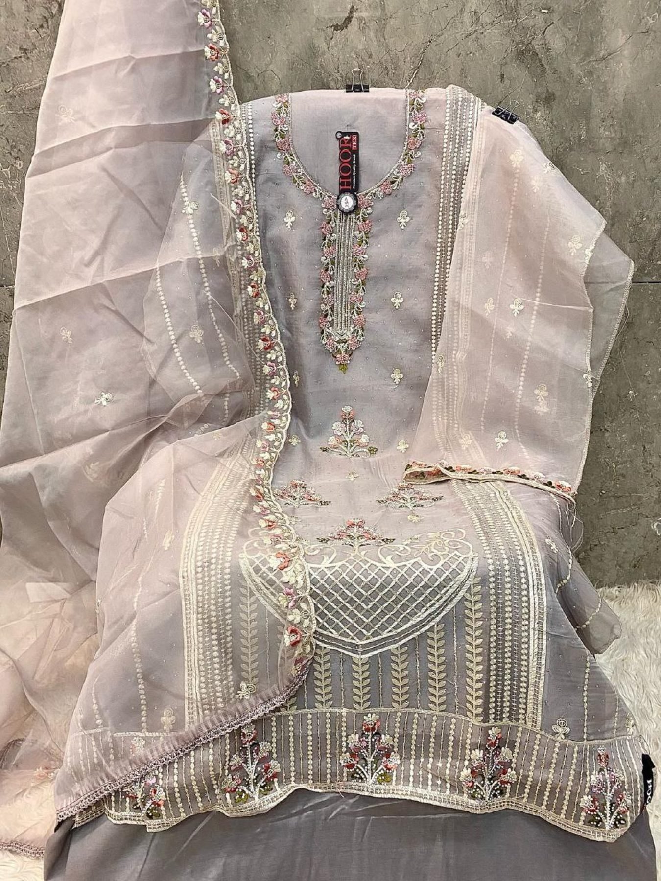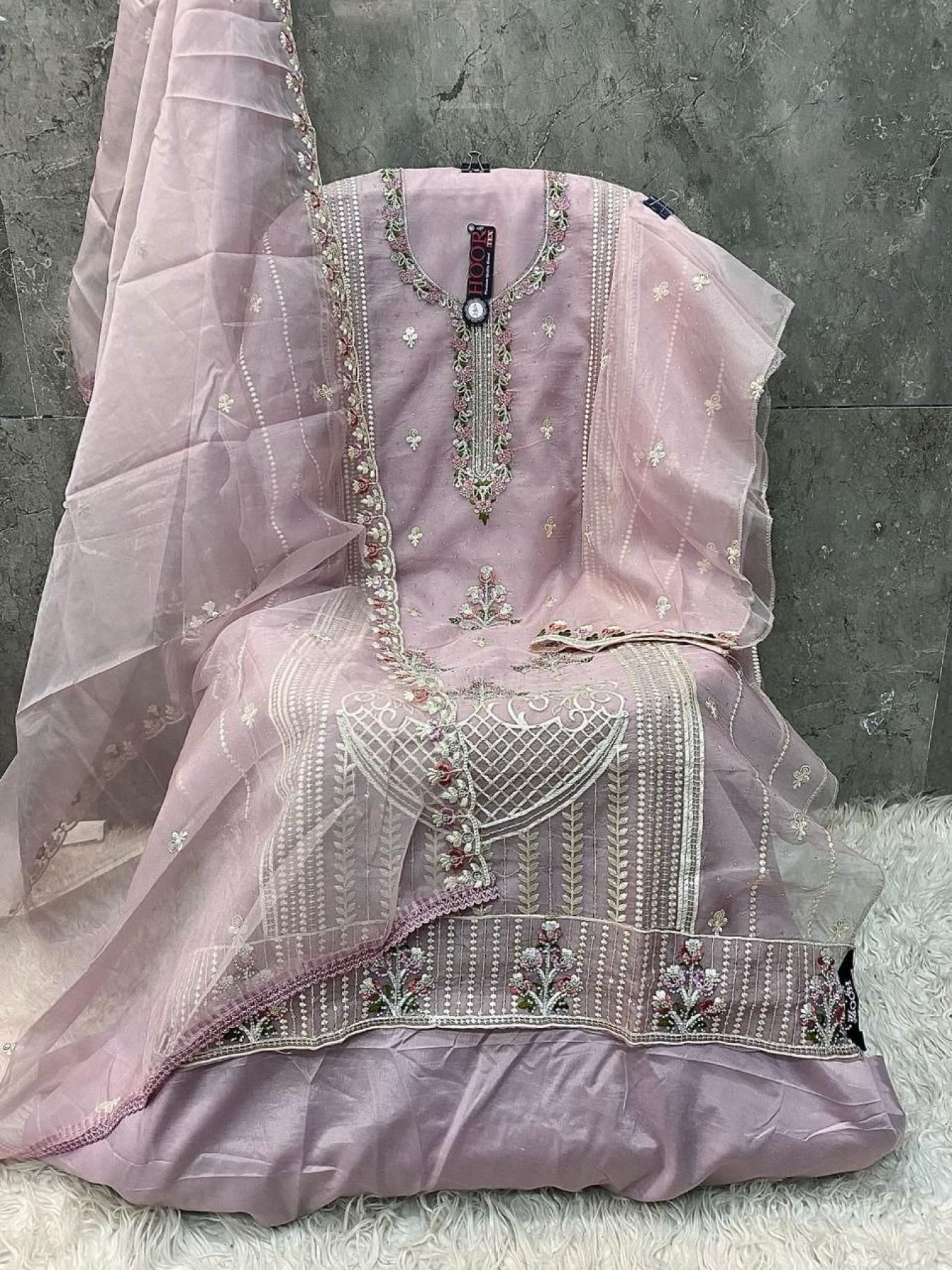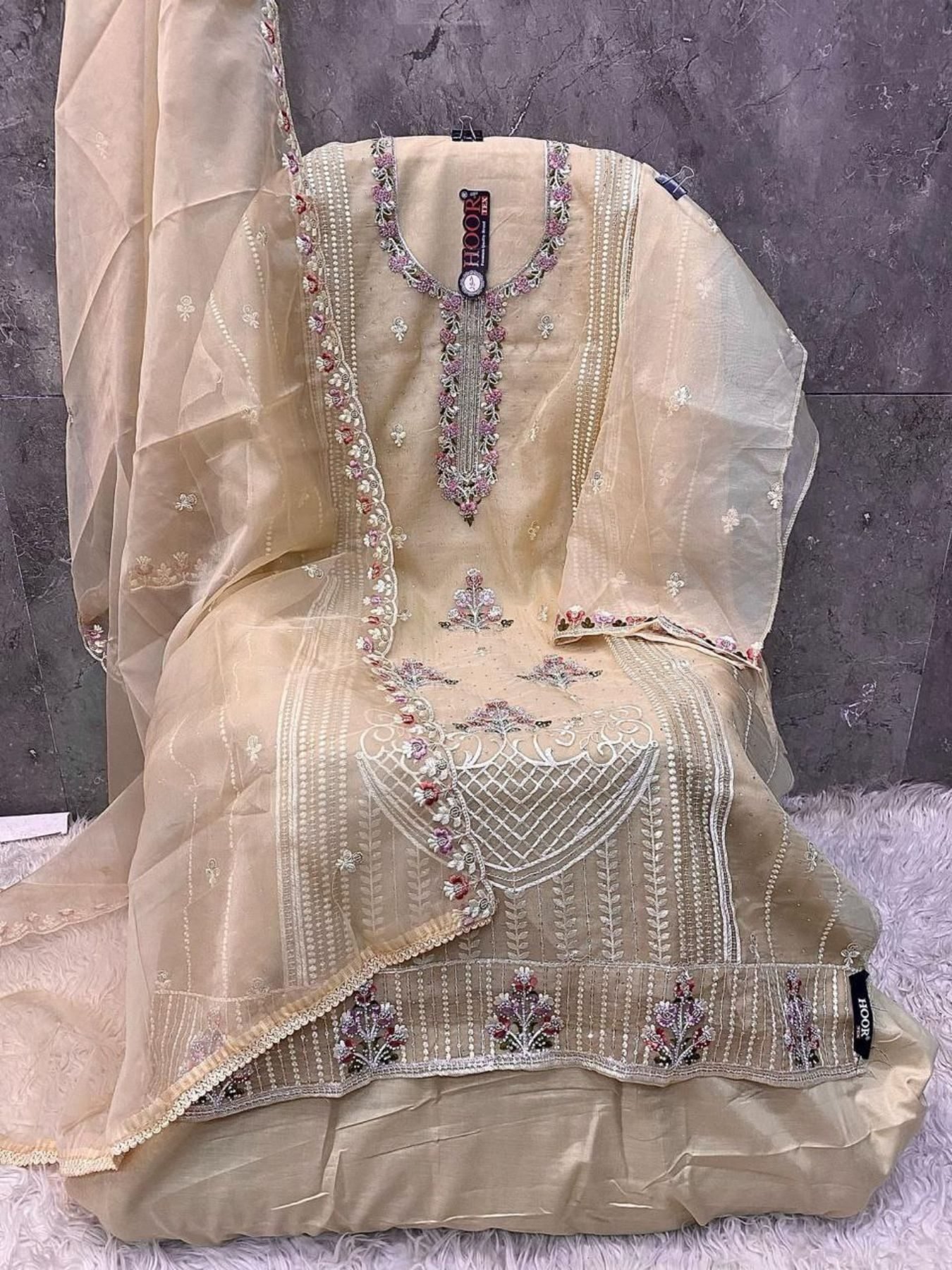 Bring timeless charm to your wardrobe with this beautiful Organza suit set. Adorned with intricate Khatli work, it’s perfect for festive gatherings, celebrations, and elegant daywear.