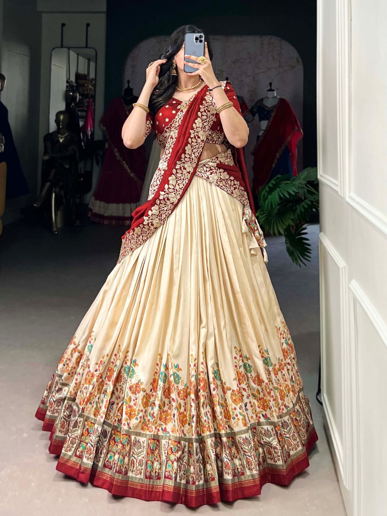 Heavy Tussar Silk Lehenga Choli With Foil Print And Embroidered Vichitra Silk Dupatta Elegant Designer Lehenga Set for Best Offer