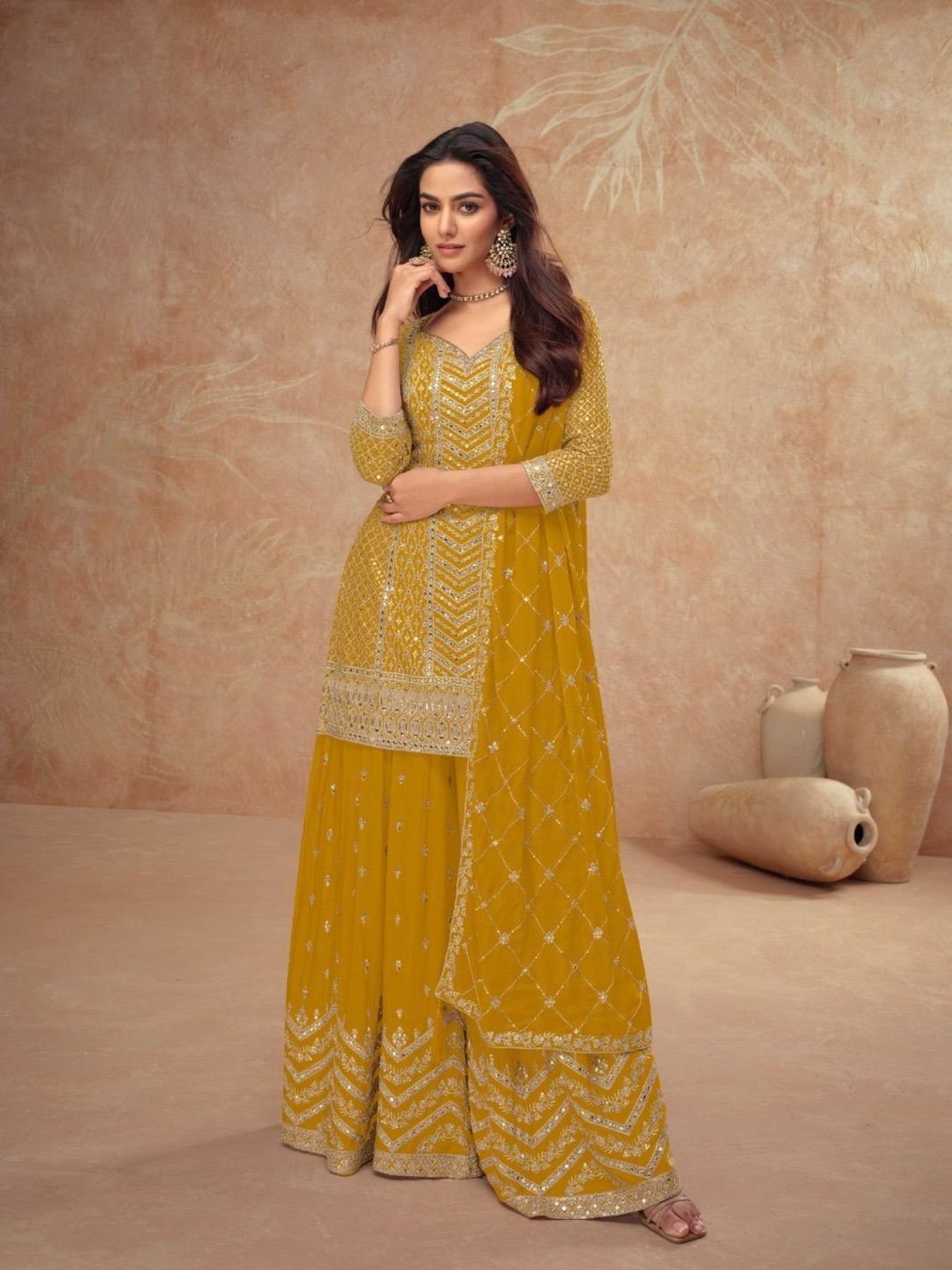 Heavy Yellow Designer Embroidery Work Chinon Fabric Palazzo Dress