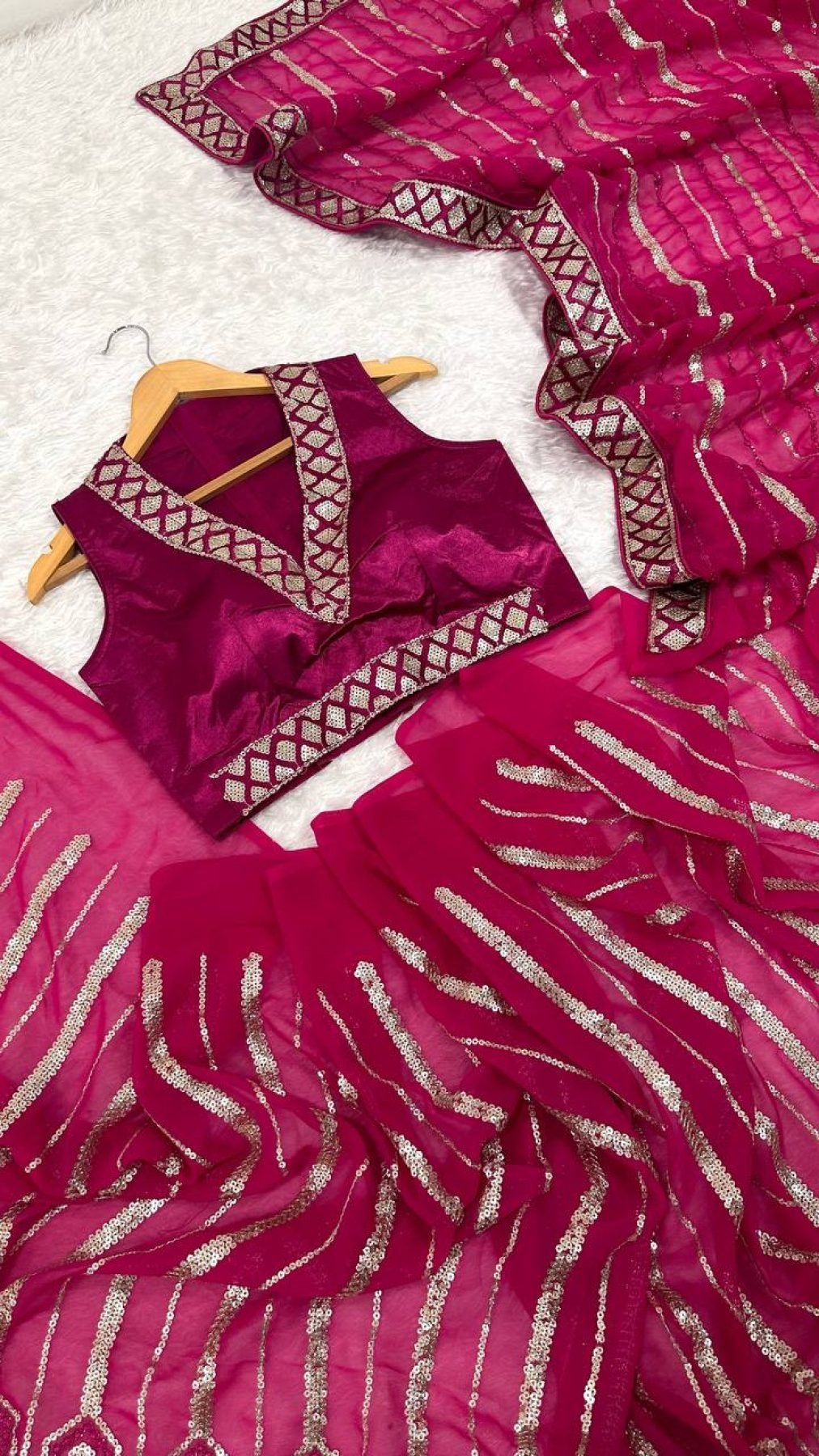 Drape yourself in effortless glamour with this Pink Georgette Saree, beautifully adorned with sequins, thread, and dori embroidery work. Paired with a luxurious Japan Satin blouse embellished with delicate sequins, this ensemble radiates charm — perfect for weddings, receptions, and festive evenings.