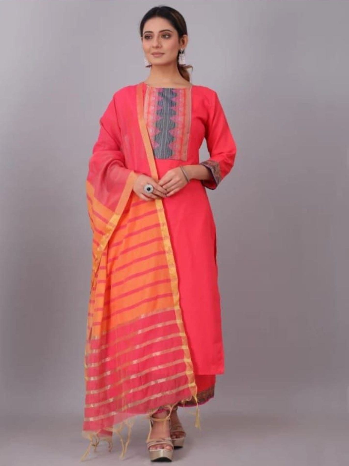 Size ChartEnhance your ethnic wardrobe with this women’s cotton Gajari kurti set, designed for both elegance and everyday comfort. Made from heavy cotton fabric, the kurta features a calf-length straight silhouette, a round neckline, 3/4th regular sleeves, and side slits, offering a timeless and flattering fit. The plain solid design adds sophistication, making it ideal for festive gatherings, casual outings, and office wear.