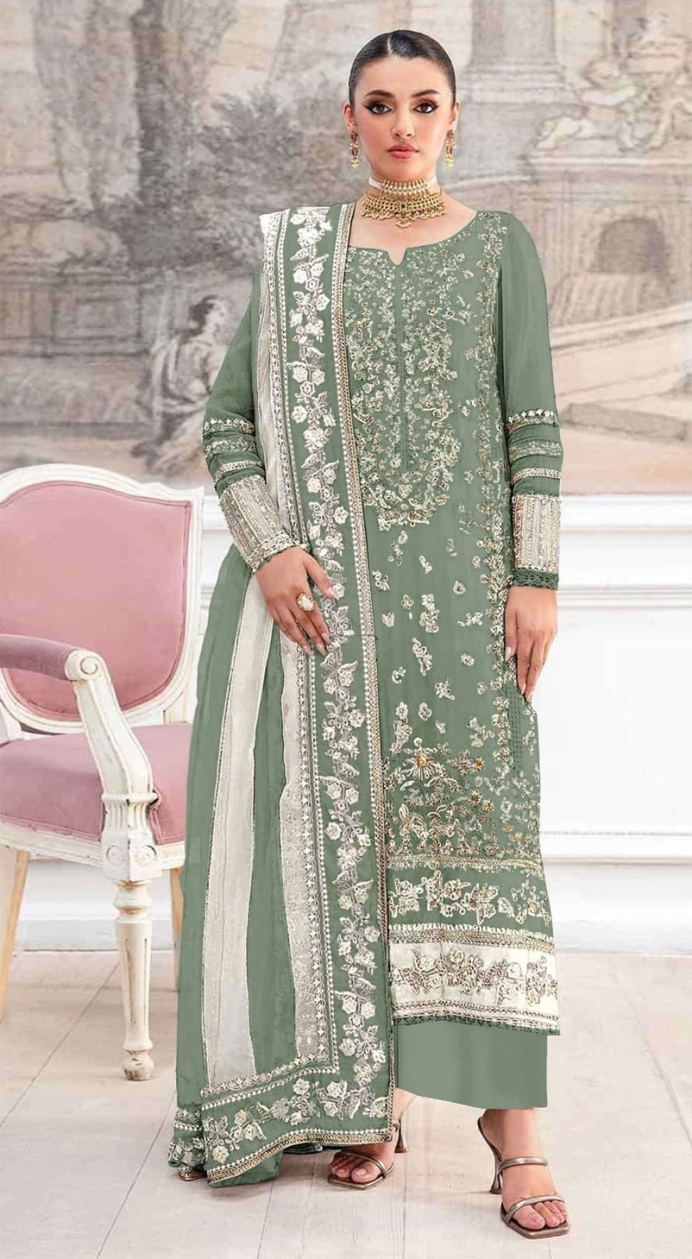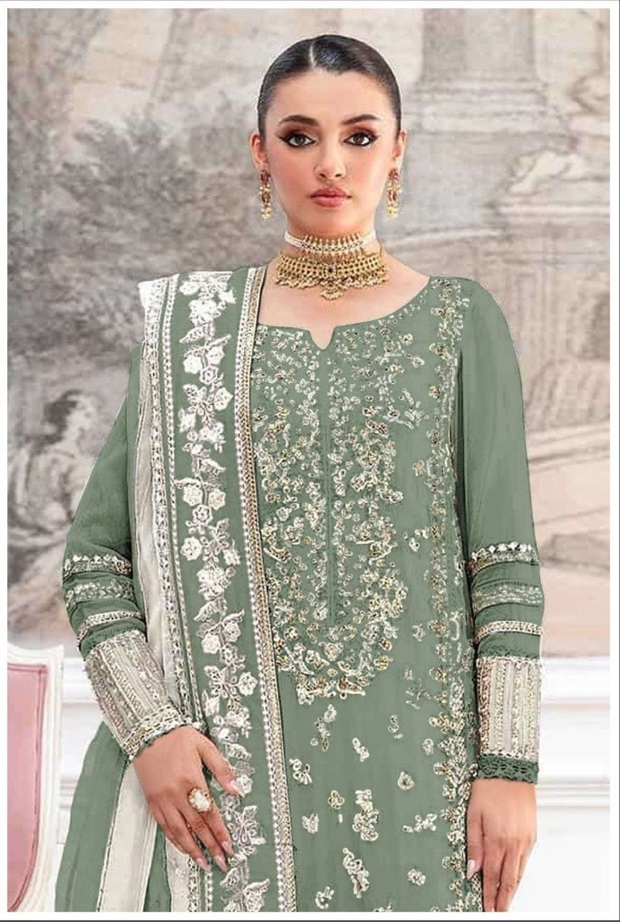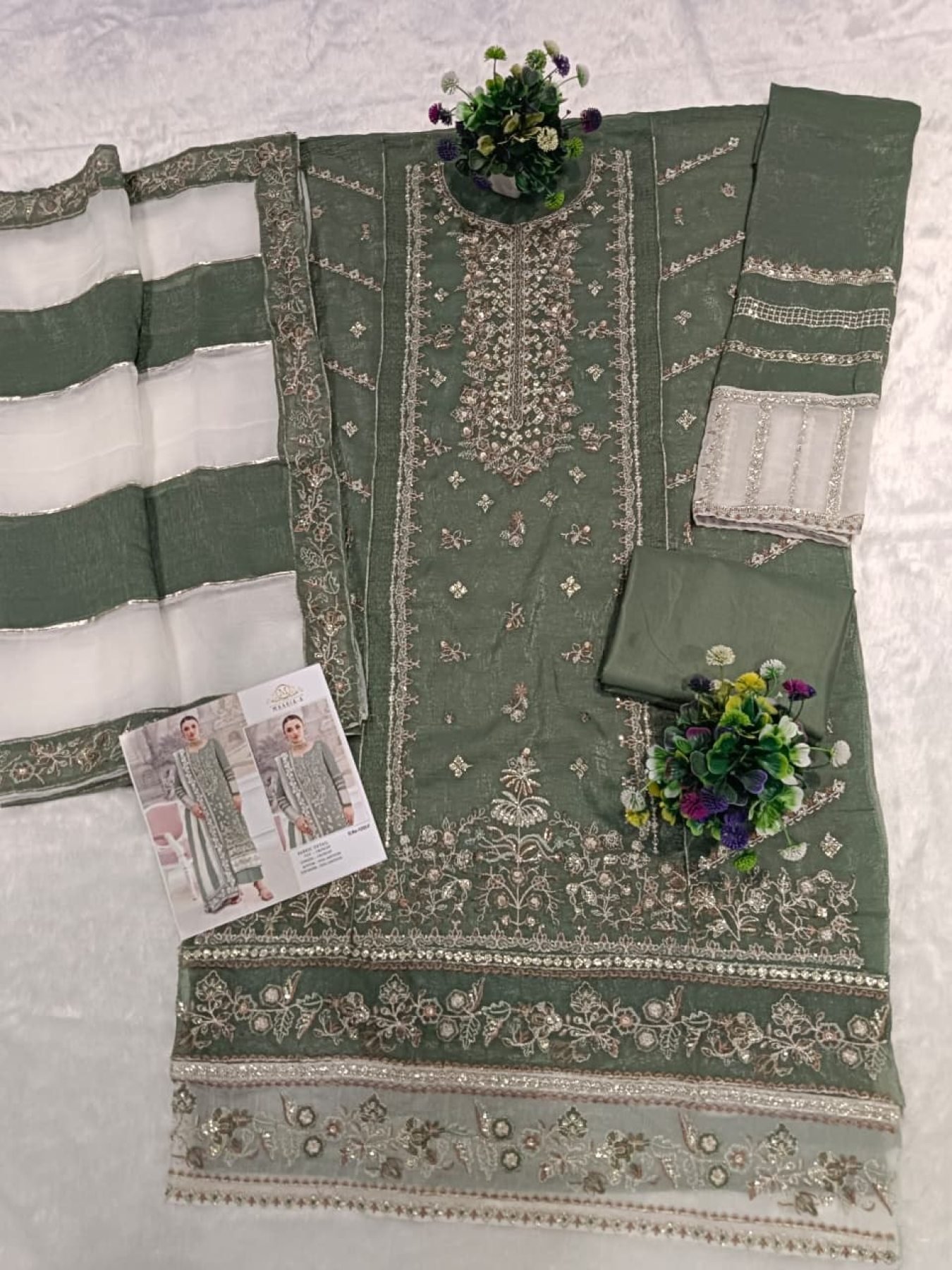 Premium crunchy fabric suit set featuring heavy embroidery sequence and khatli work, paired with santoon bottom and elegant lace dupatta. Available in material and readymade options, perfect for wedding, festive, and party wear.