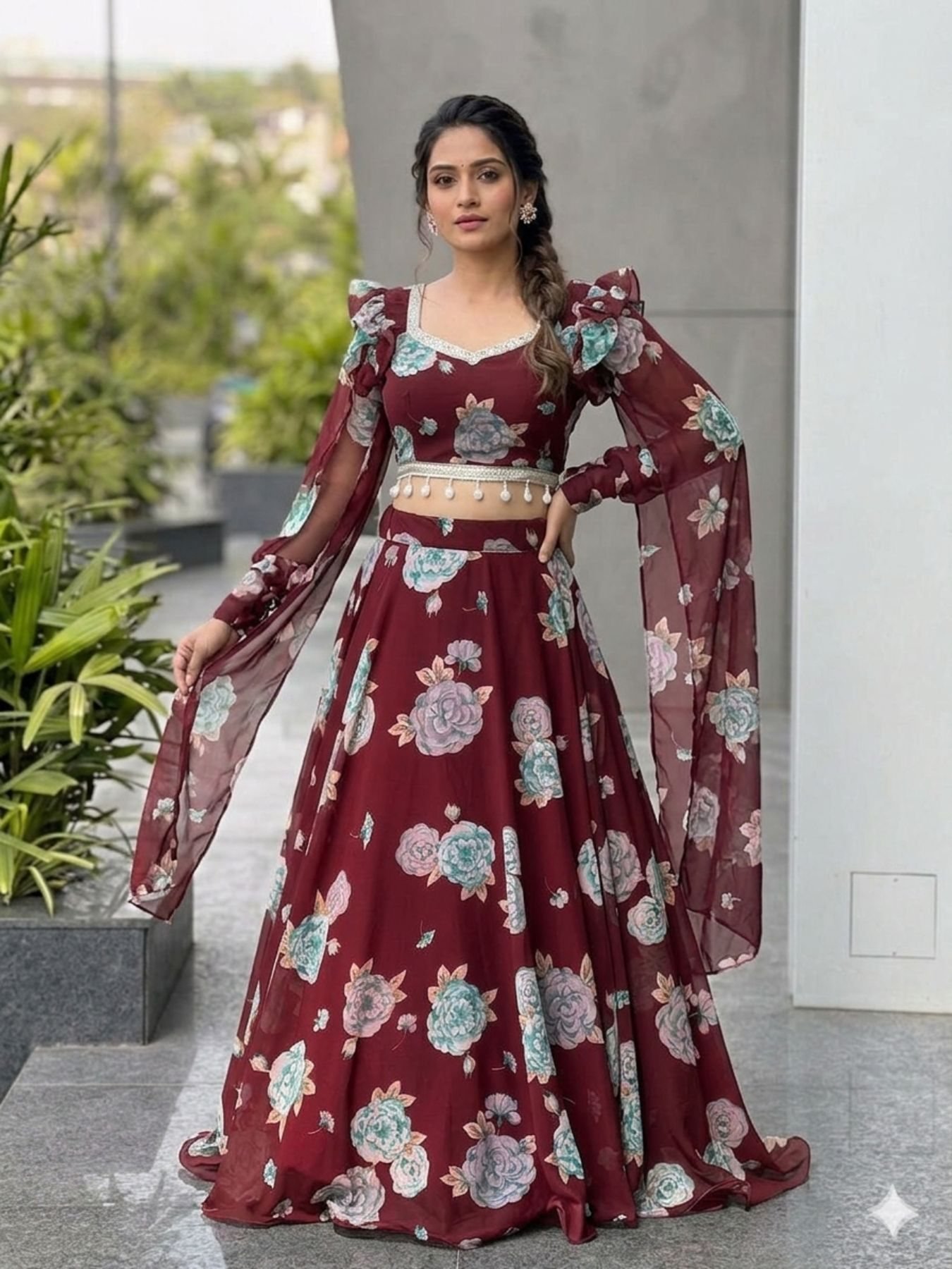 Iconic Maroon Floral Handpainted Organza Lehenga Set With Ruffled Sleeves.