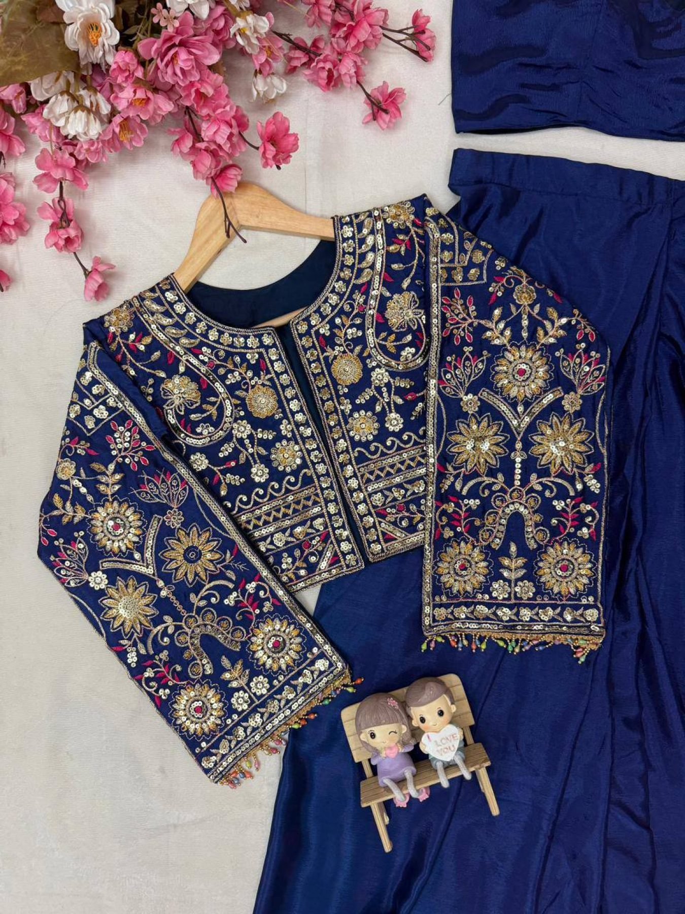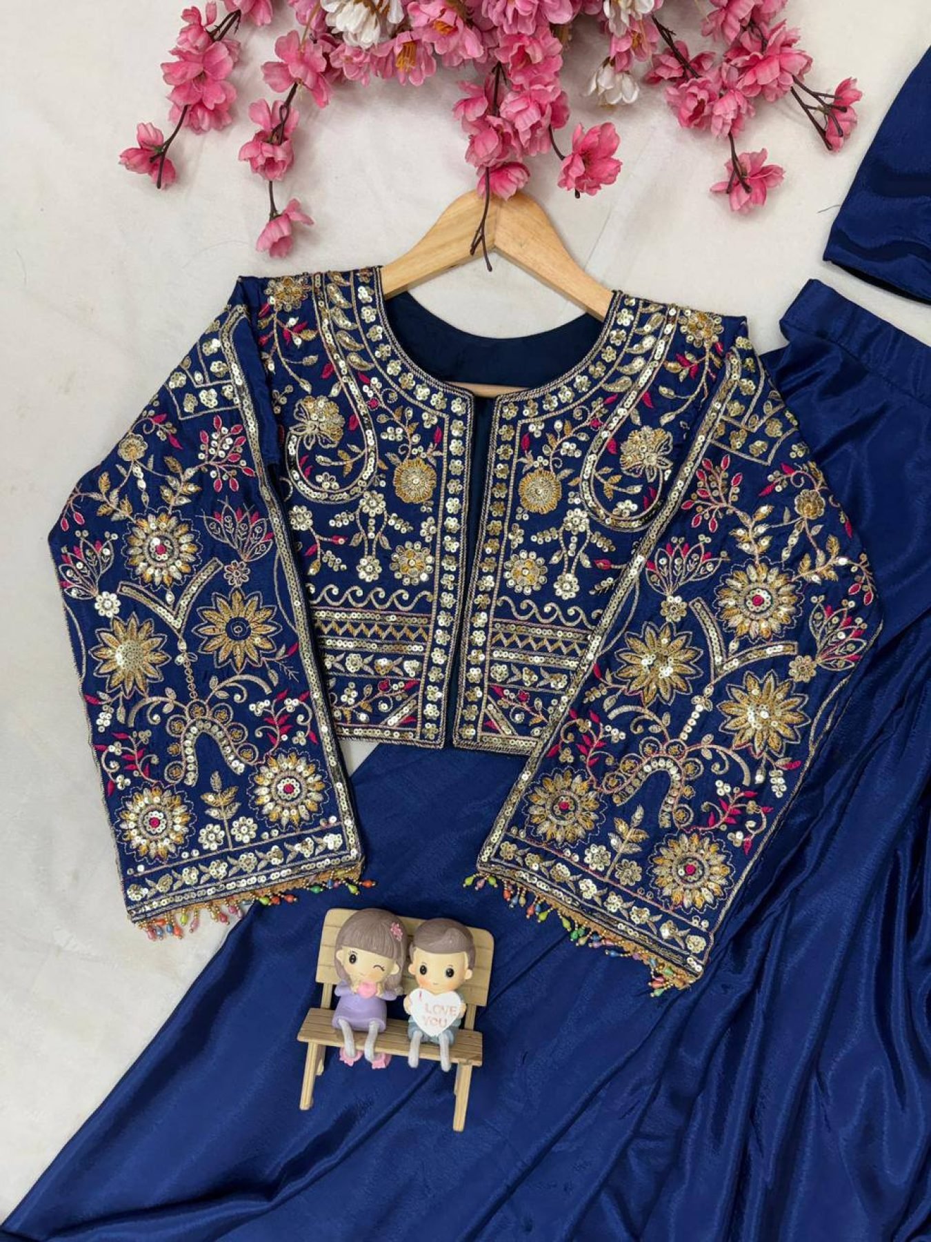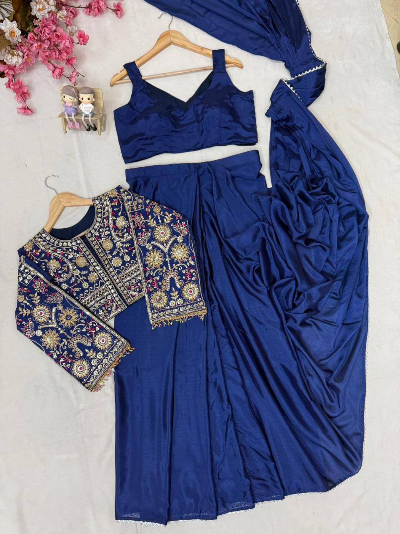 Elegant chinon silk lehenga saree set paired with embroidered koti jacket featuring zari and thread work. Perfect for modern festive wear, weddings, and stylish party looks.
