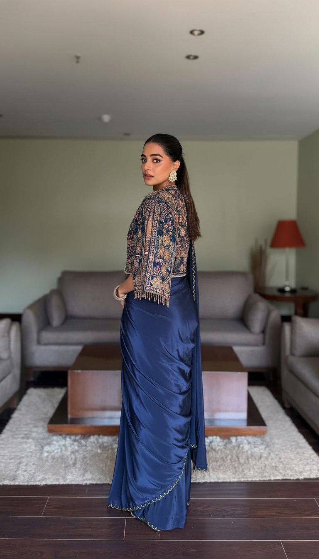 Iconic Navy Blue Lycra Drape Saree with Embroidered Silk Jacket