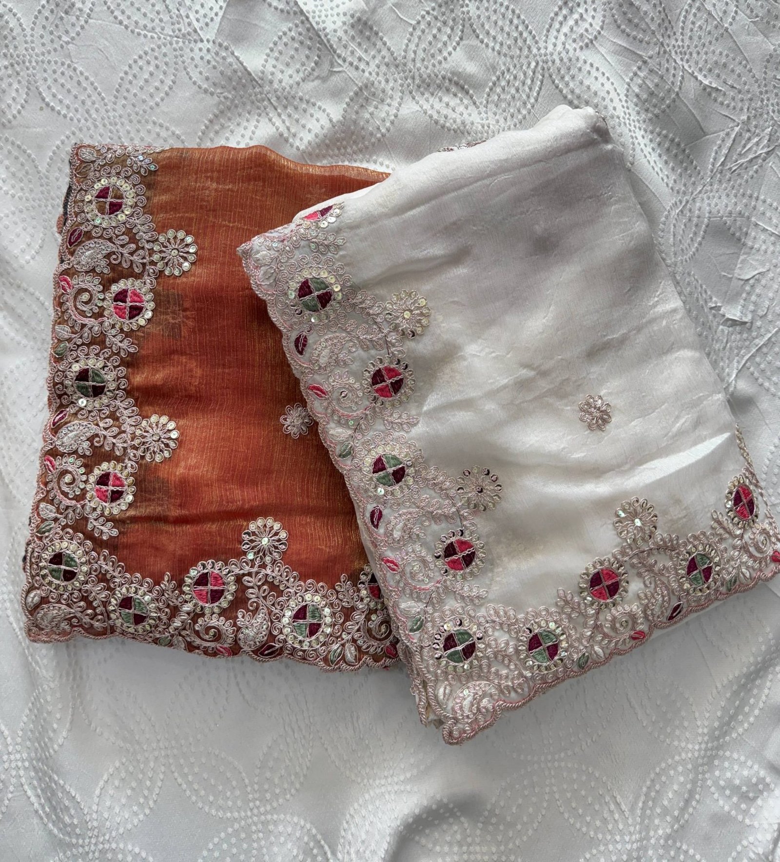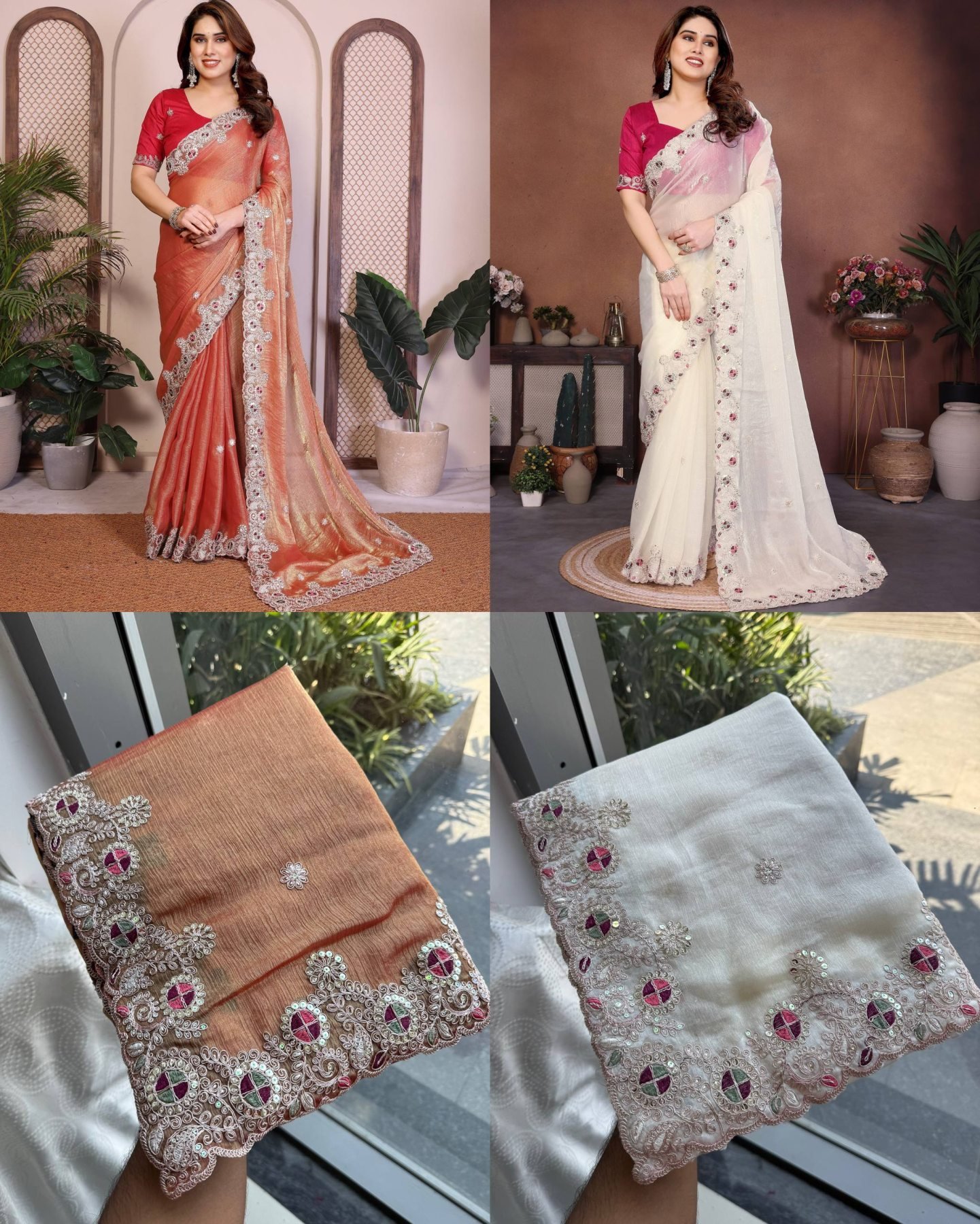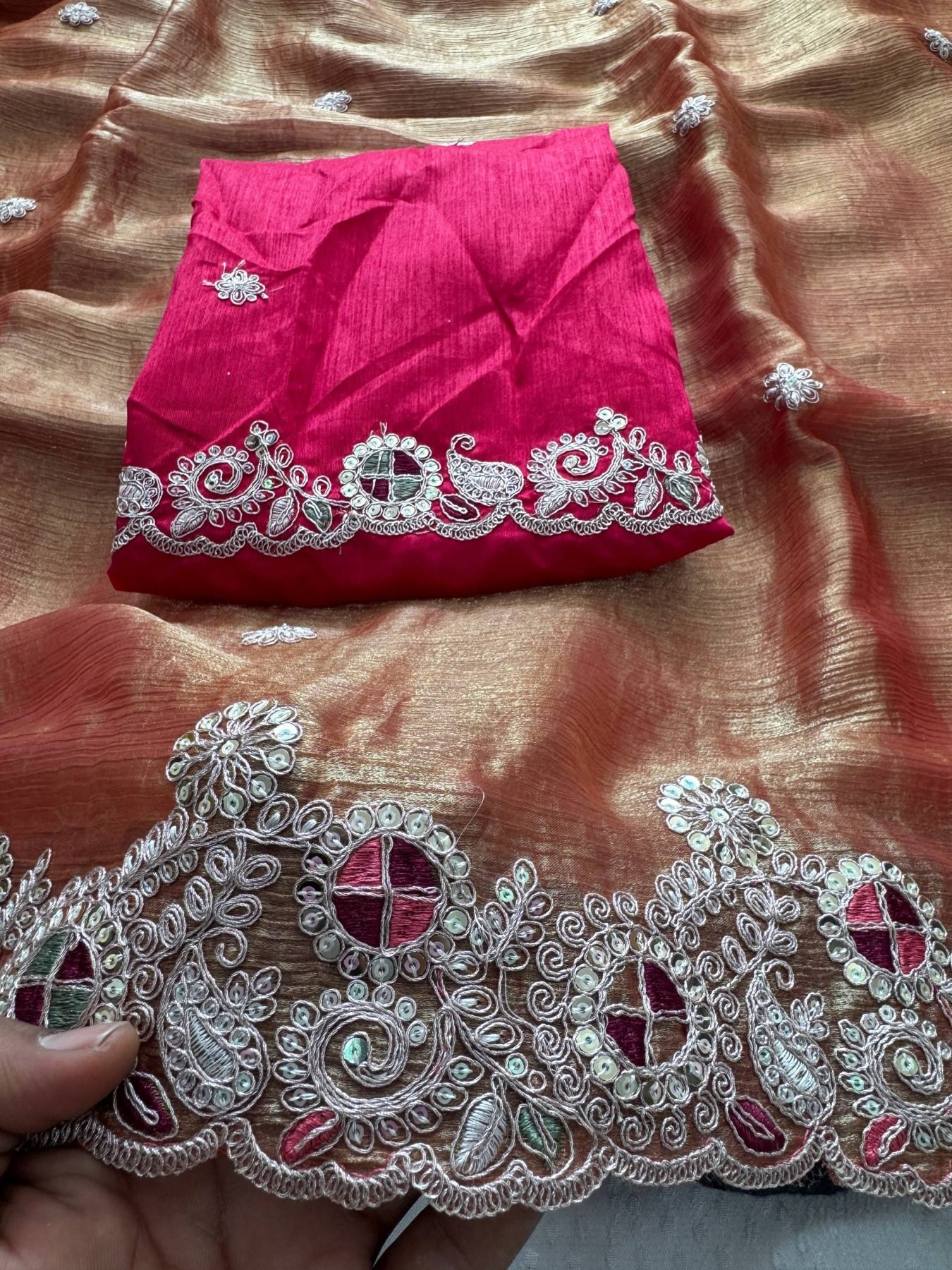 soft fendy chiffon silk saree featuring all-over embroidery butta design with piping border and rich C-pallu. Paired with a heavy embroidered mono Banglory silk blouse, perfect for wedding and party wear.