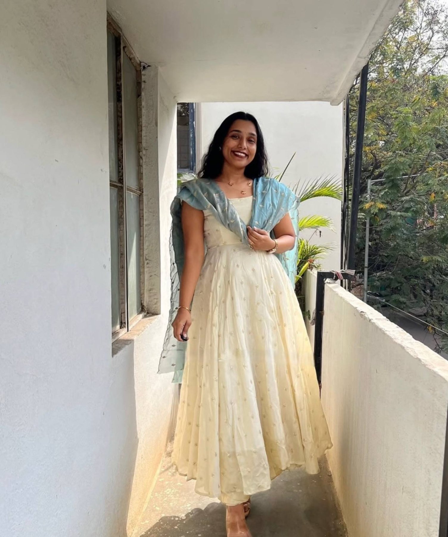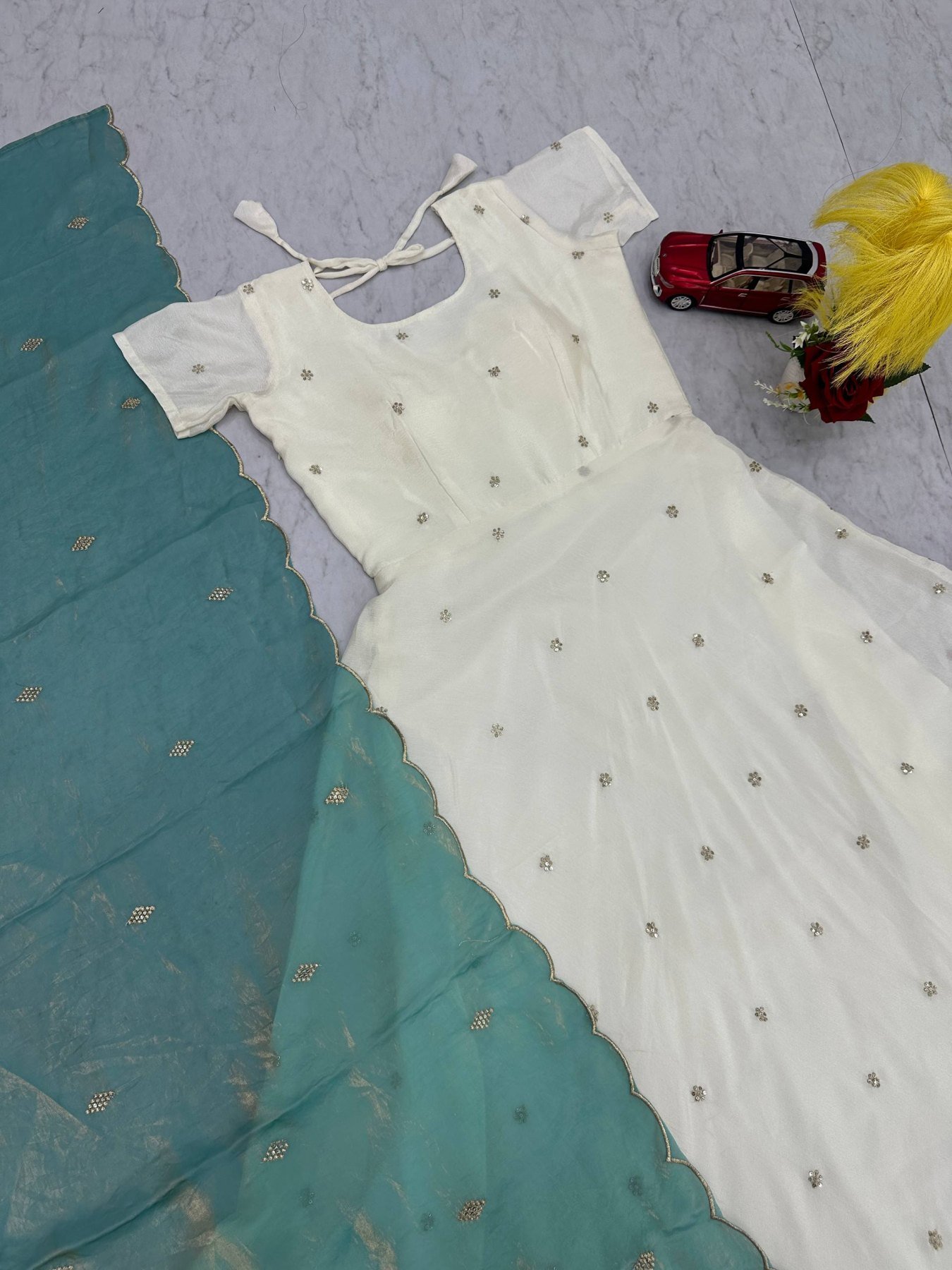 Elegant designer gown crafted in premium chinnon silk featuring beautiful embroidery sequence work. Designed with a comfortable micro cotton inner and graceful 4 meter flair, paired with a stylish fendi silk dupatta, making it perfect for festive occasions, parties, and special events.