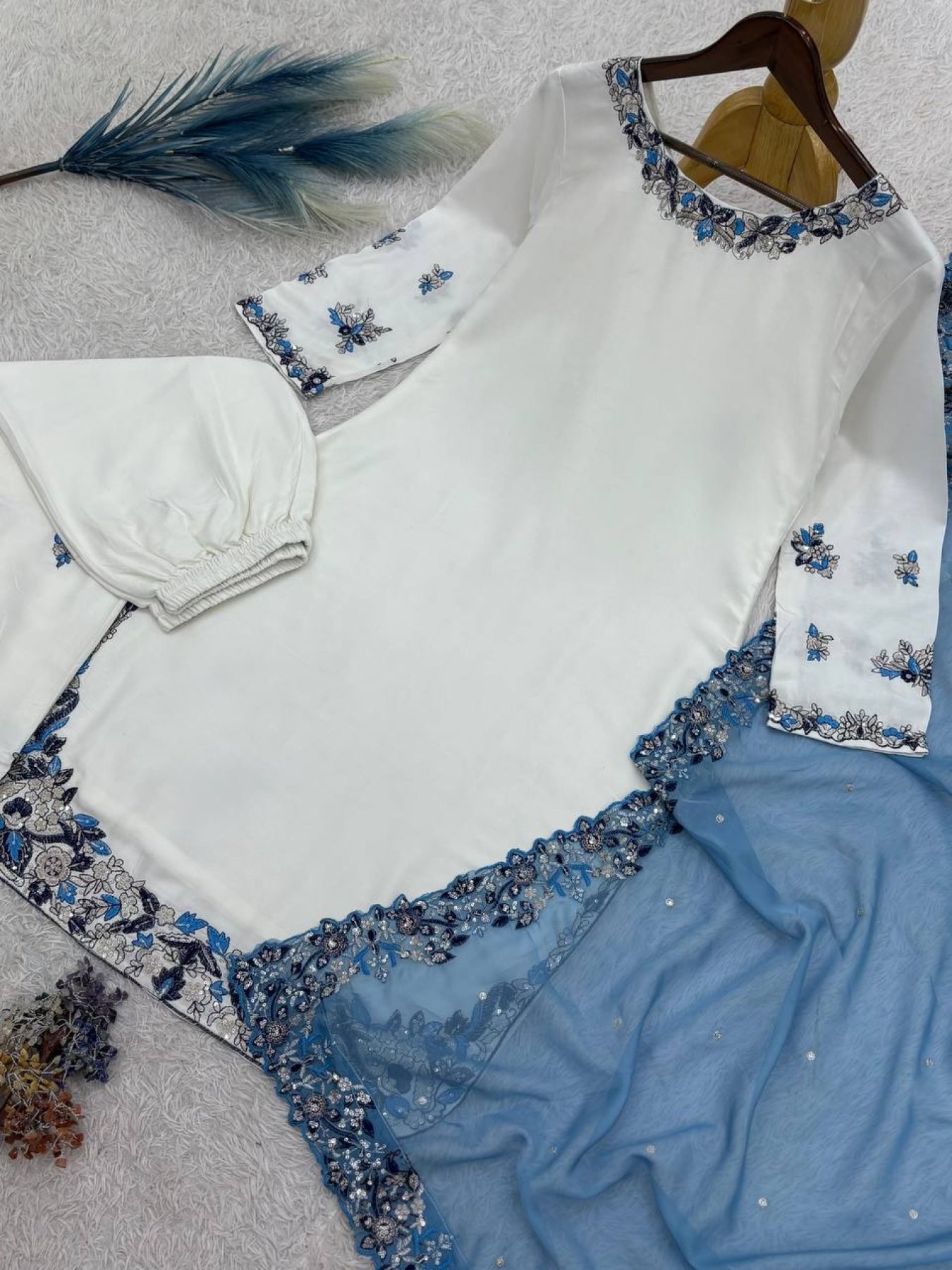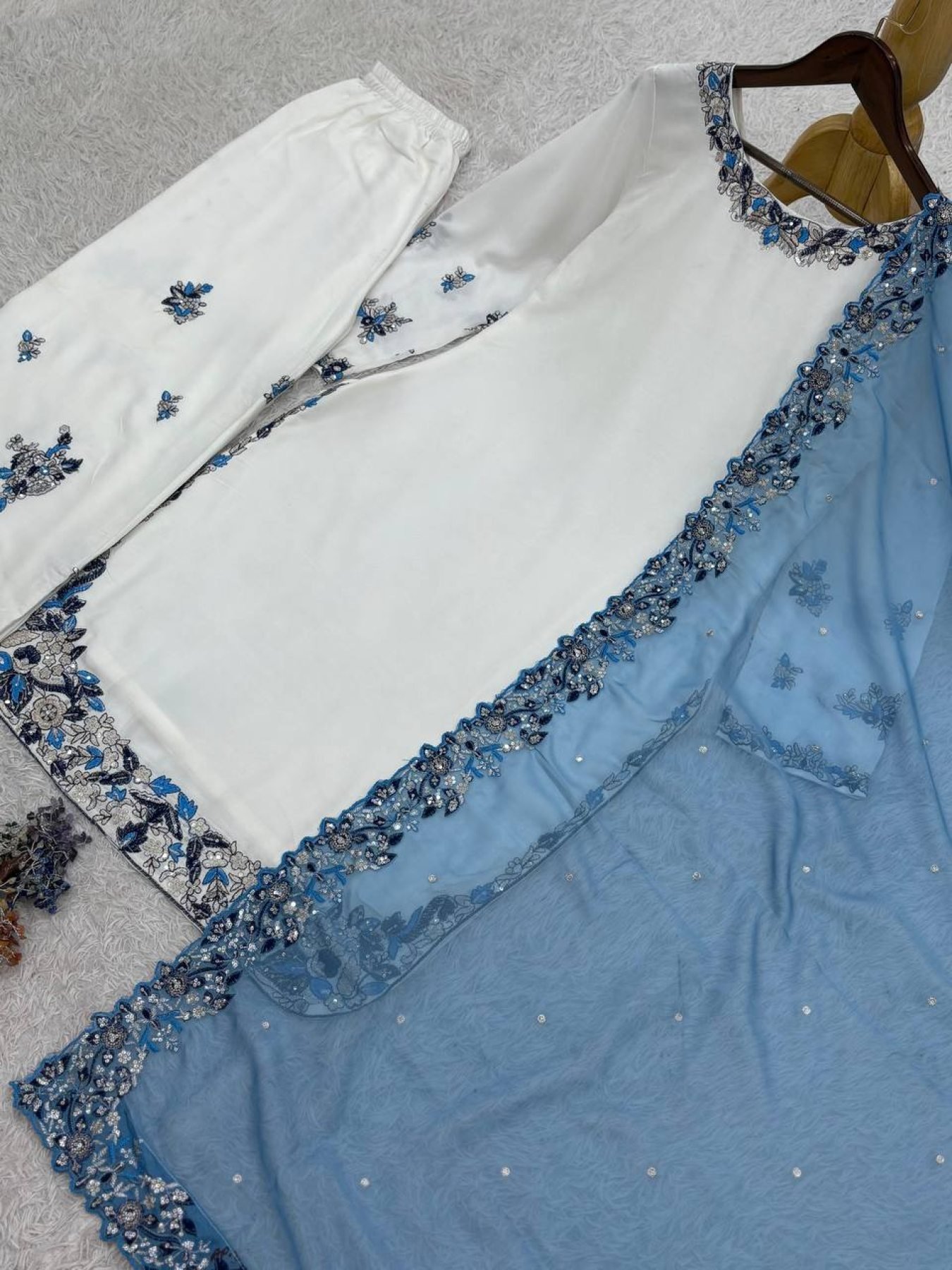 Elegant ready-to-wear rayon cotton palazzo suit set featuring heavy embroidery and sequins work. Paired with embroidered palazzo and luxurious Kundan organza silk dupatta for a rich festive and party wear look.