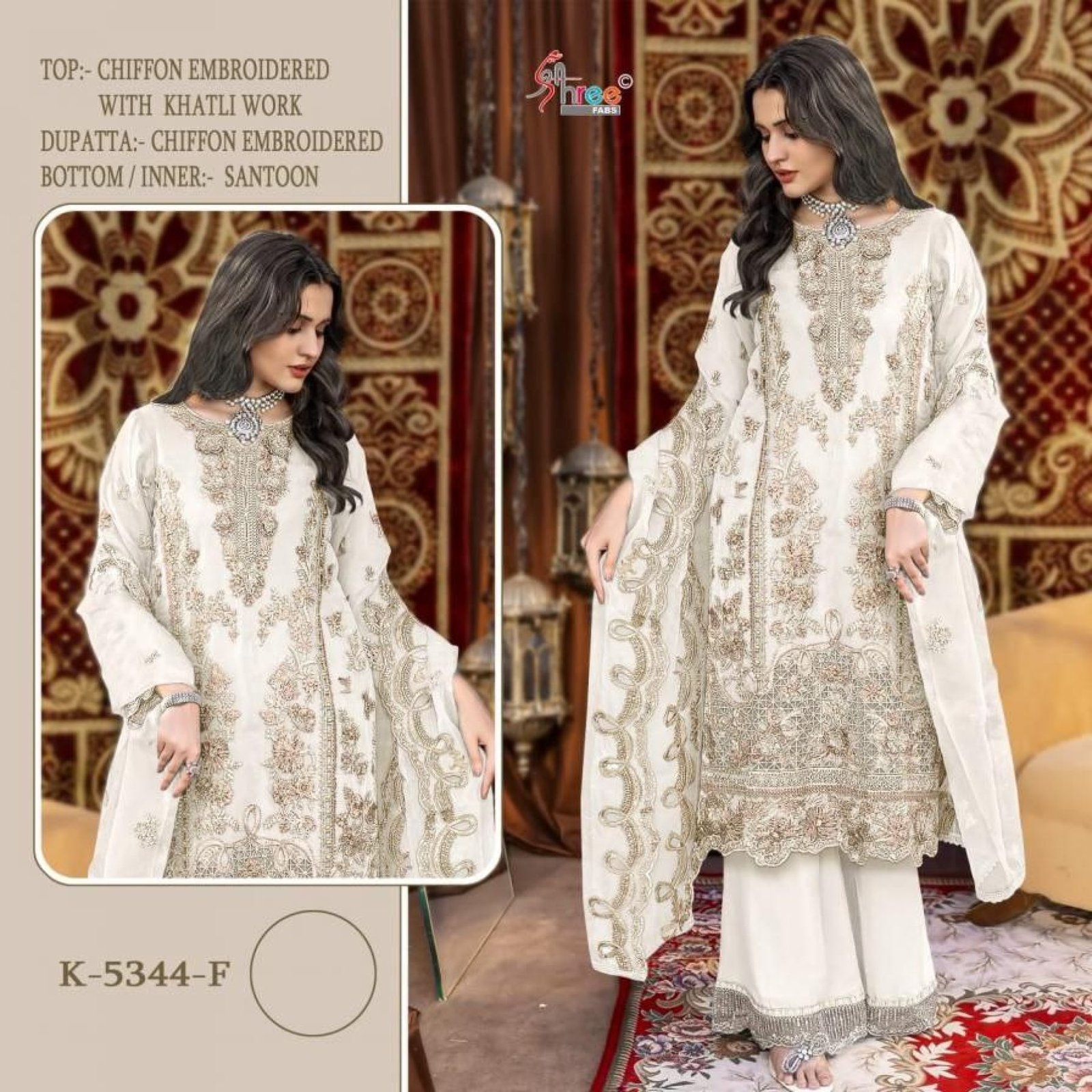 Shree Designer D.No. K 5344 is a luxurious partywear suit crafted in heavy dinting chiffon with intricate hand khatli embroidery. Paired with a smooth santoon dull inner and an embroidered chiffon dupatta, this set is ideal for festive occasions, boutiques, and wholesale buyers seeking premium quality at manufacturer pricing.