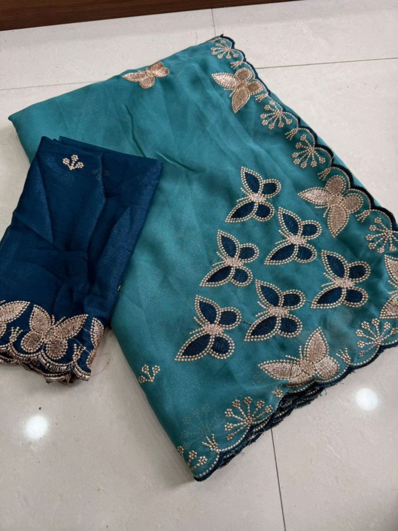 Elegant star georgette saree featuring multi embroidery work paired with matching running blouse. Lightweight and perfect for festive and daily wear.