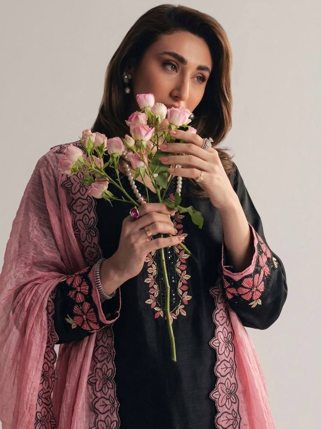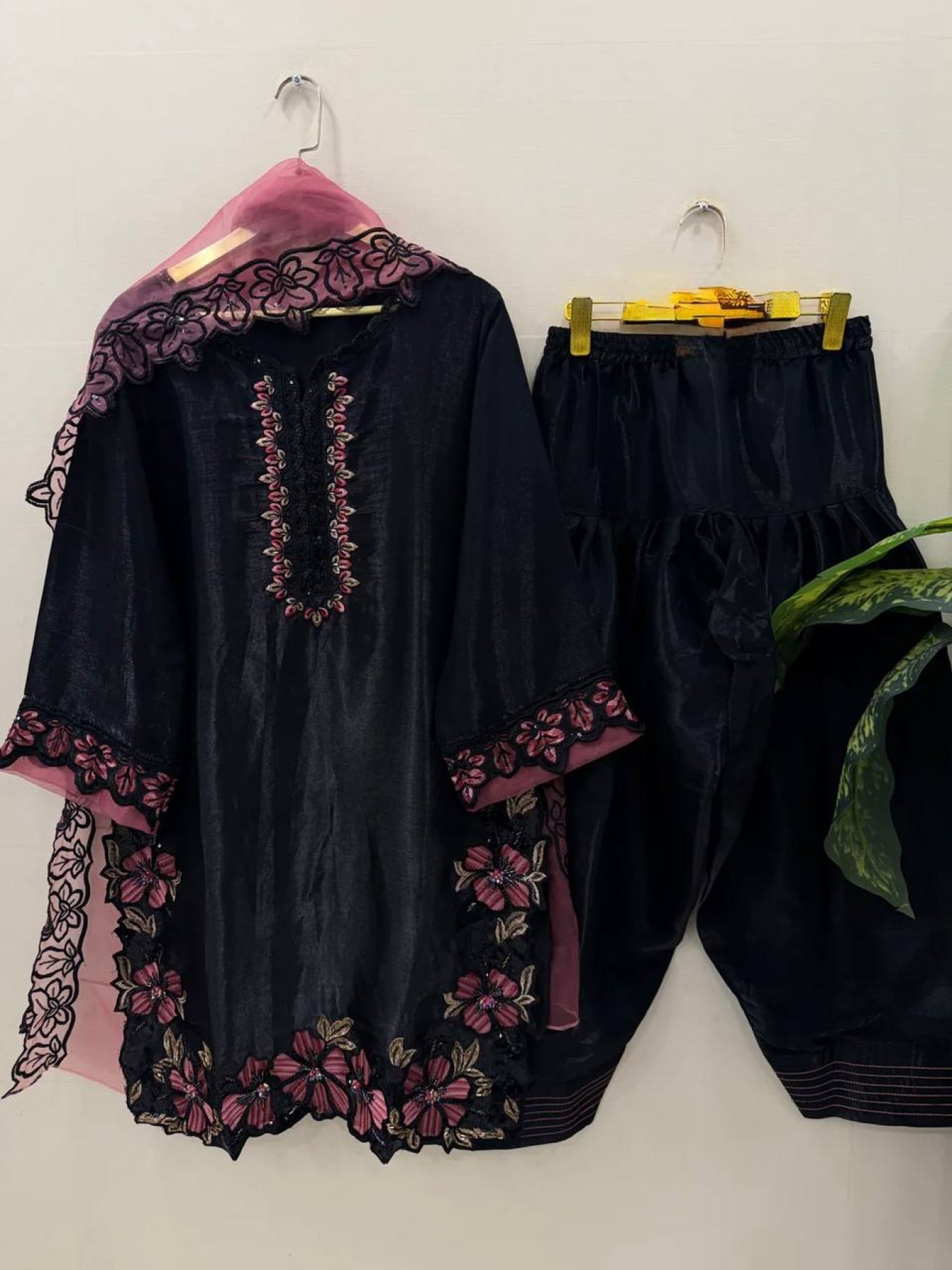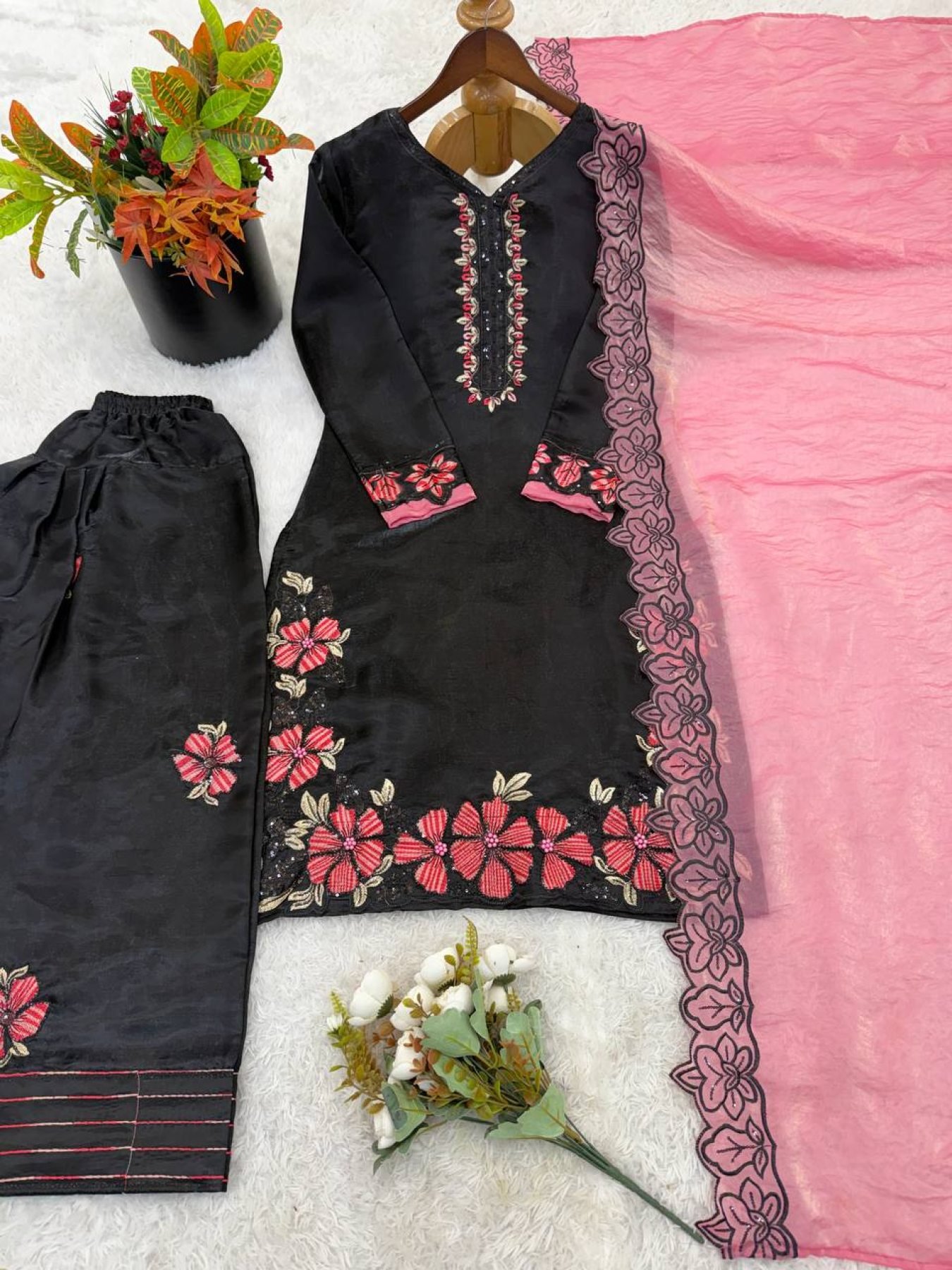Innovative Black Salwar Kameez Suit With Pink Embroidery And Matching Dupatta