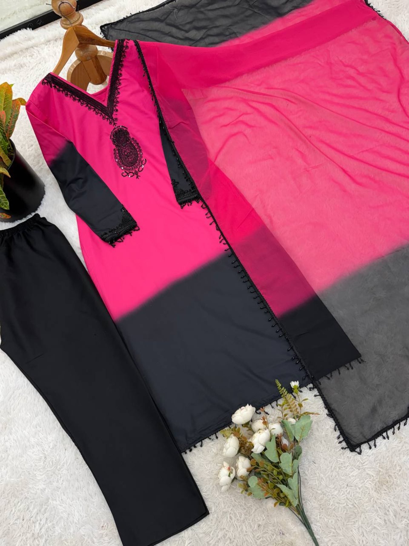 Elegant French crepe silk kurti set featuring delicate bead embroidery work with full sleeves. Paired with matching pants and a georgette dupatta with lace border, perfect for festive and party occasions.