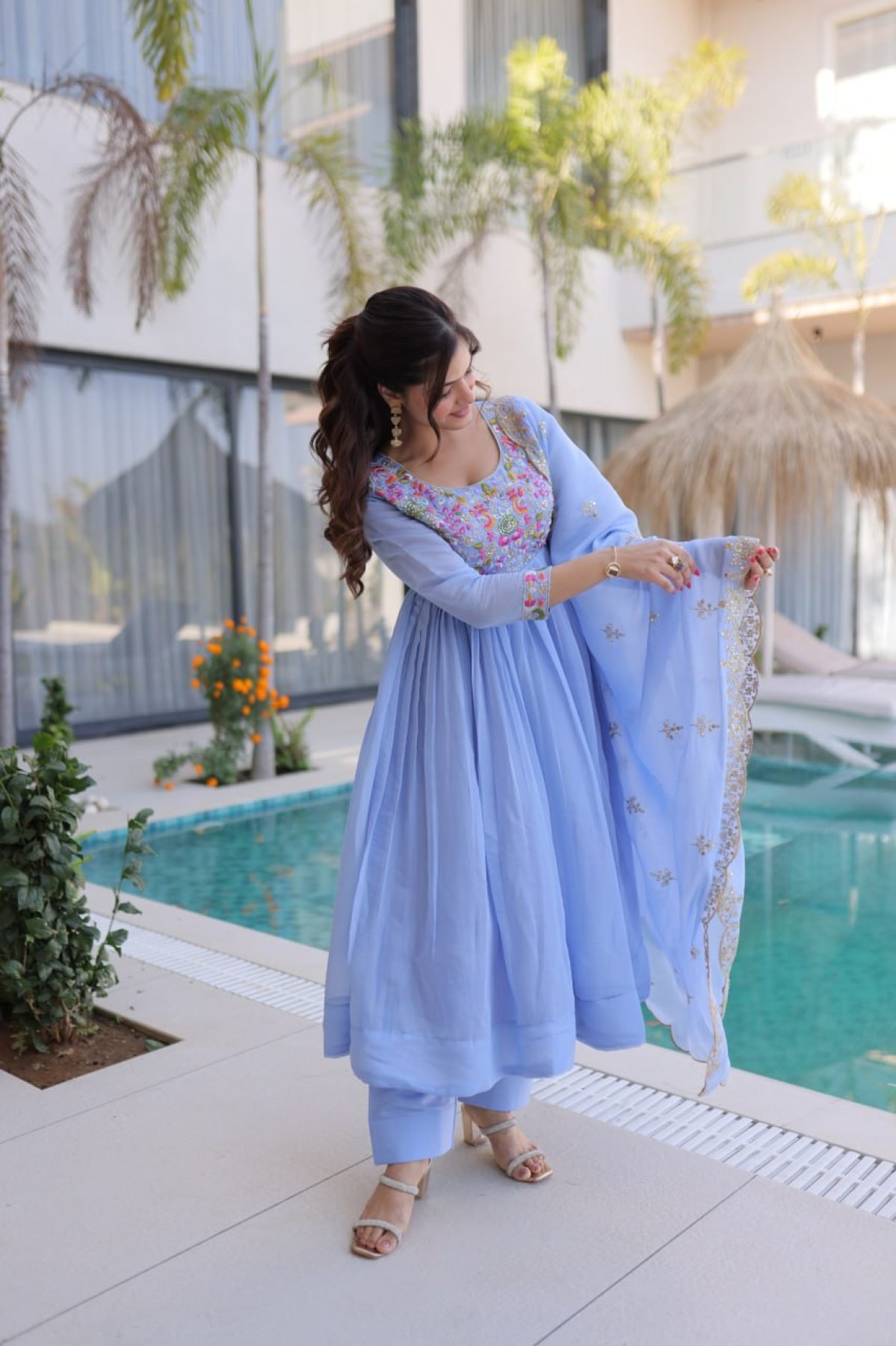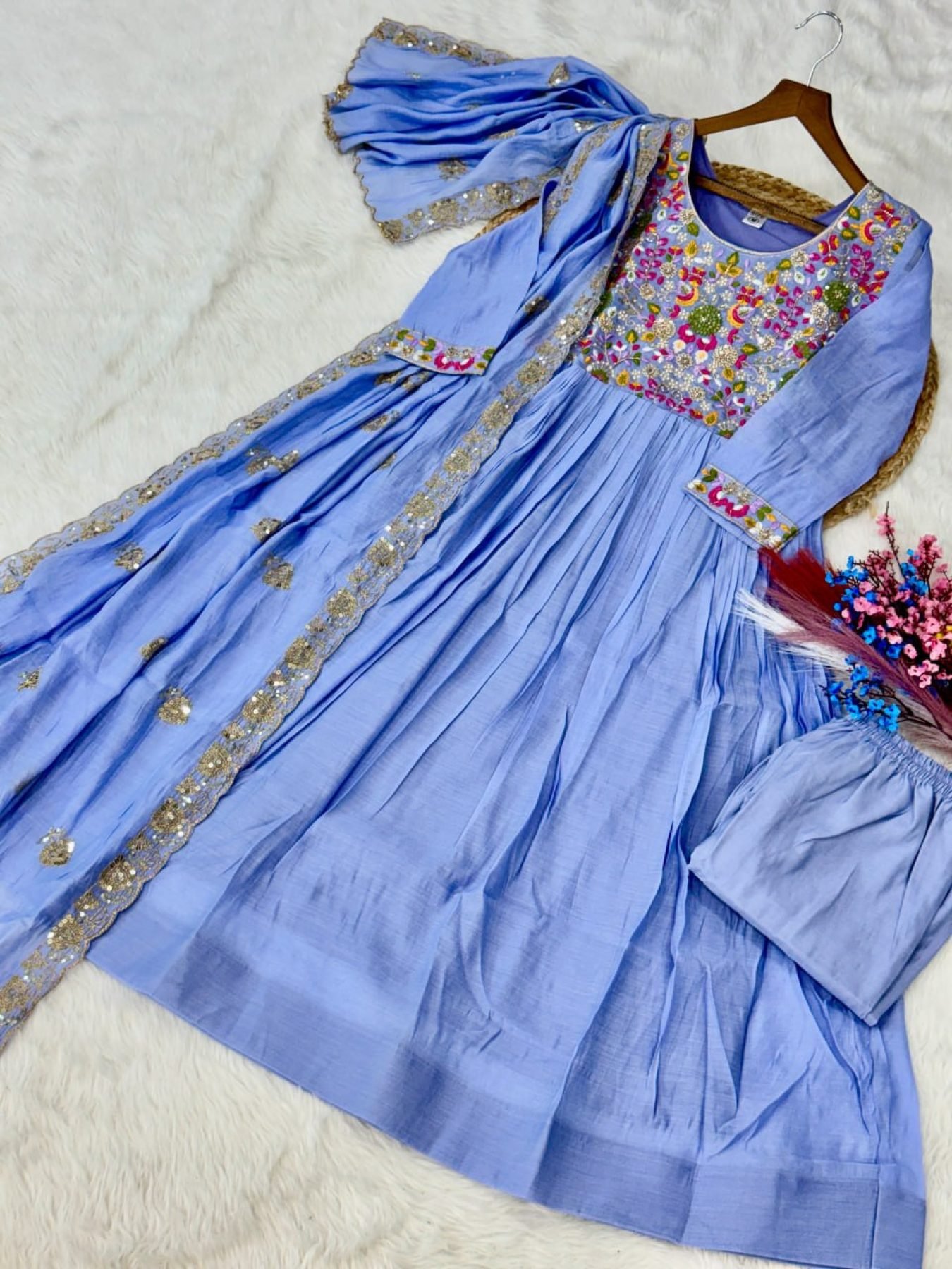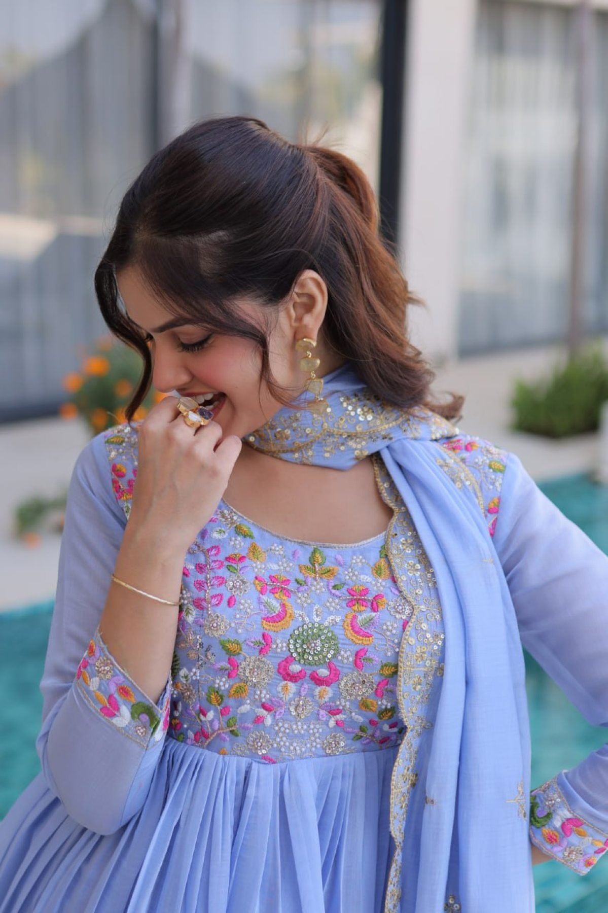 Innovative Sky Blue Elegant Chanderi Gown Set with Beads Embroidery Work