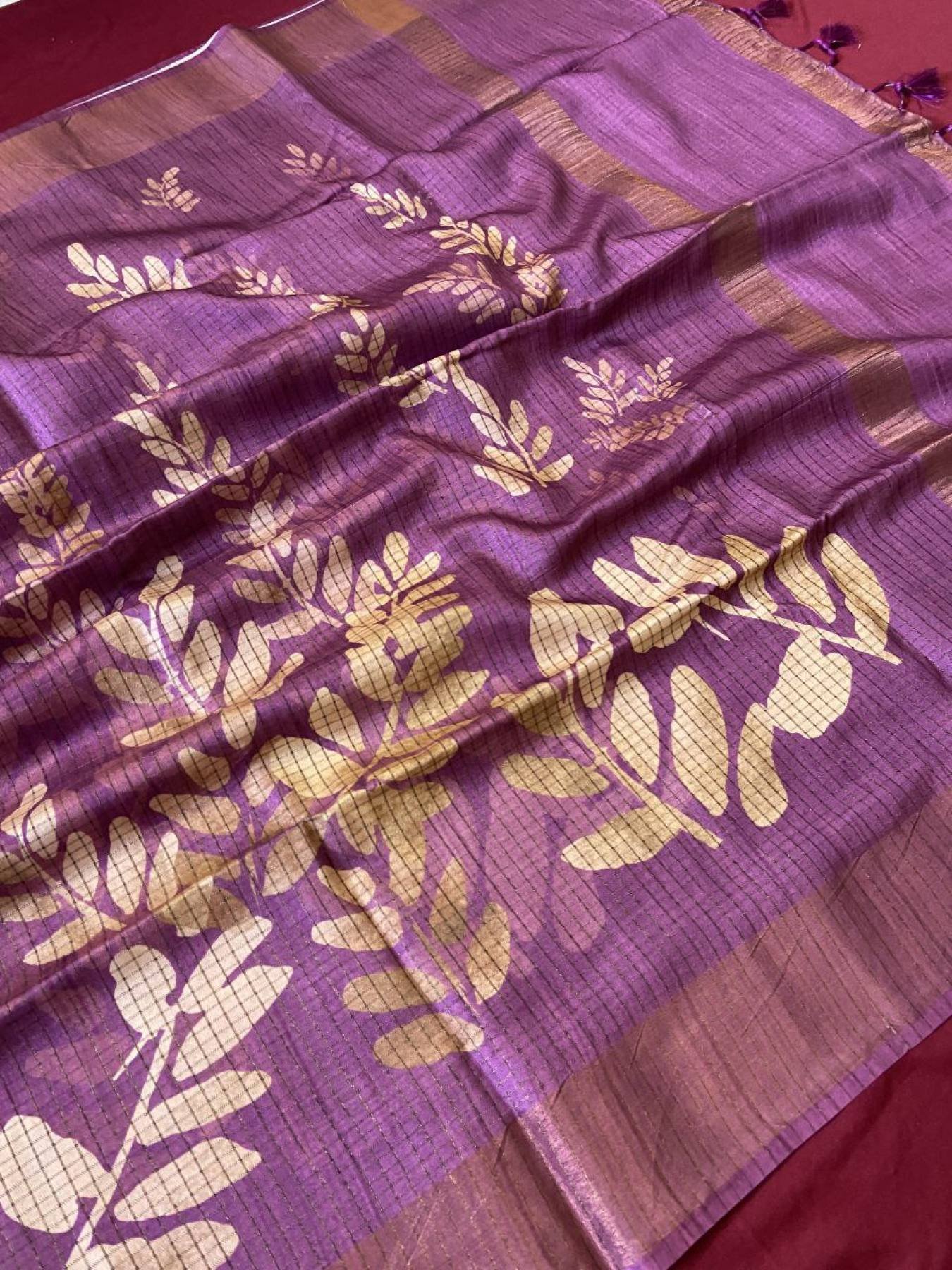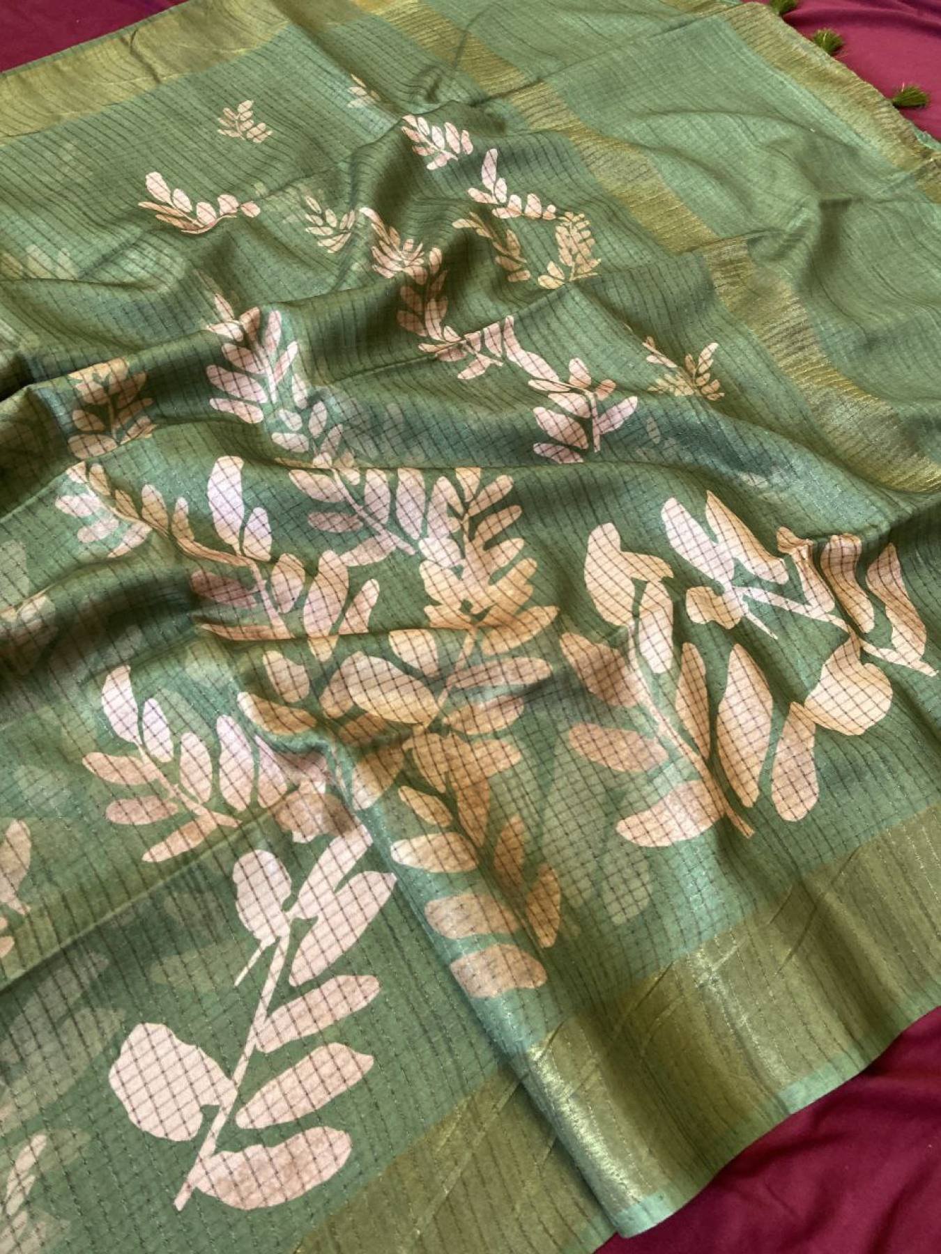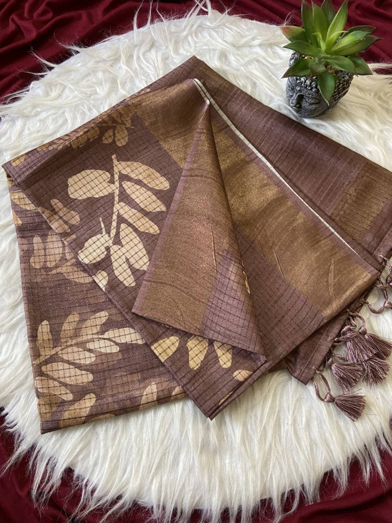 Presenting our Soft Tussar Silk Sarees — a blend of traditional elegance and modern artistry. Crafted with beautiful prints and an attractive checks design, these sarees offer a luxurious drape and sophisticated style. Completed with delicate tassels and a matching printed blouse, this saree brings a refreshing new look for festive occasions or casual elegance.