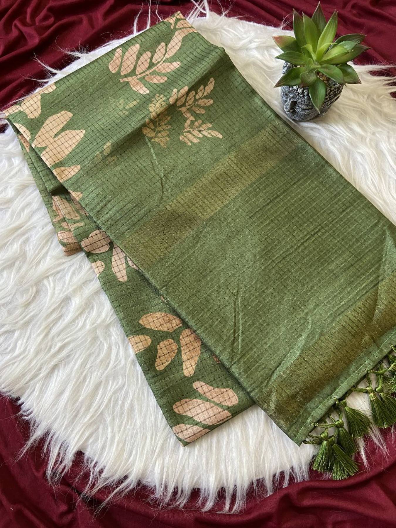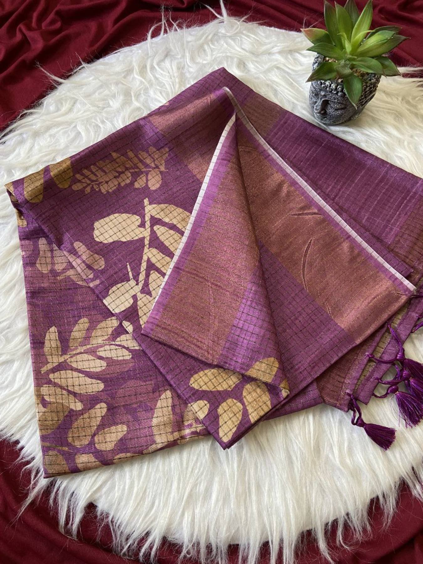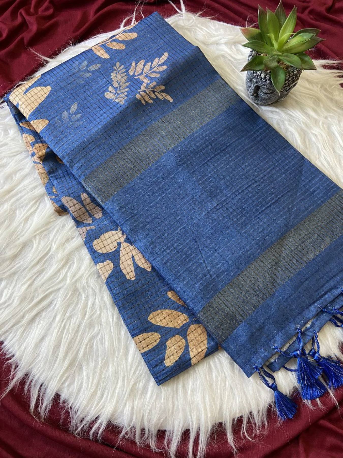 Presenting our Soft Tussar Silk Sarees — a blend of traditional elegance and modern artistry. Crafted with beautiful prints and an attractive checks design, these sarees offer a luxurious drape and sophisticated style. Completed with delicate tassels and a matching printed blouse, this saree brings a refreshing new look for festive occasions or casual elegance.