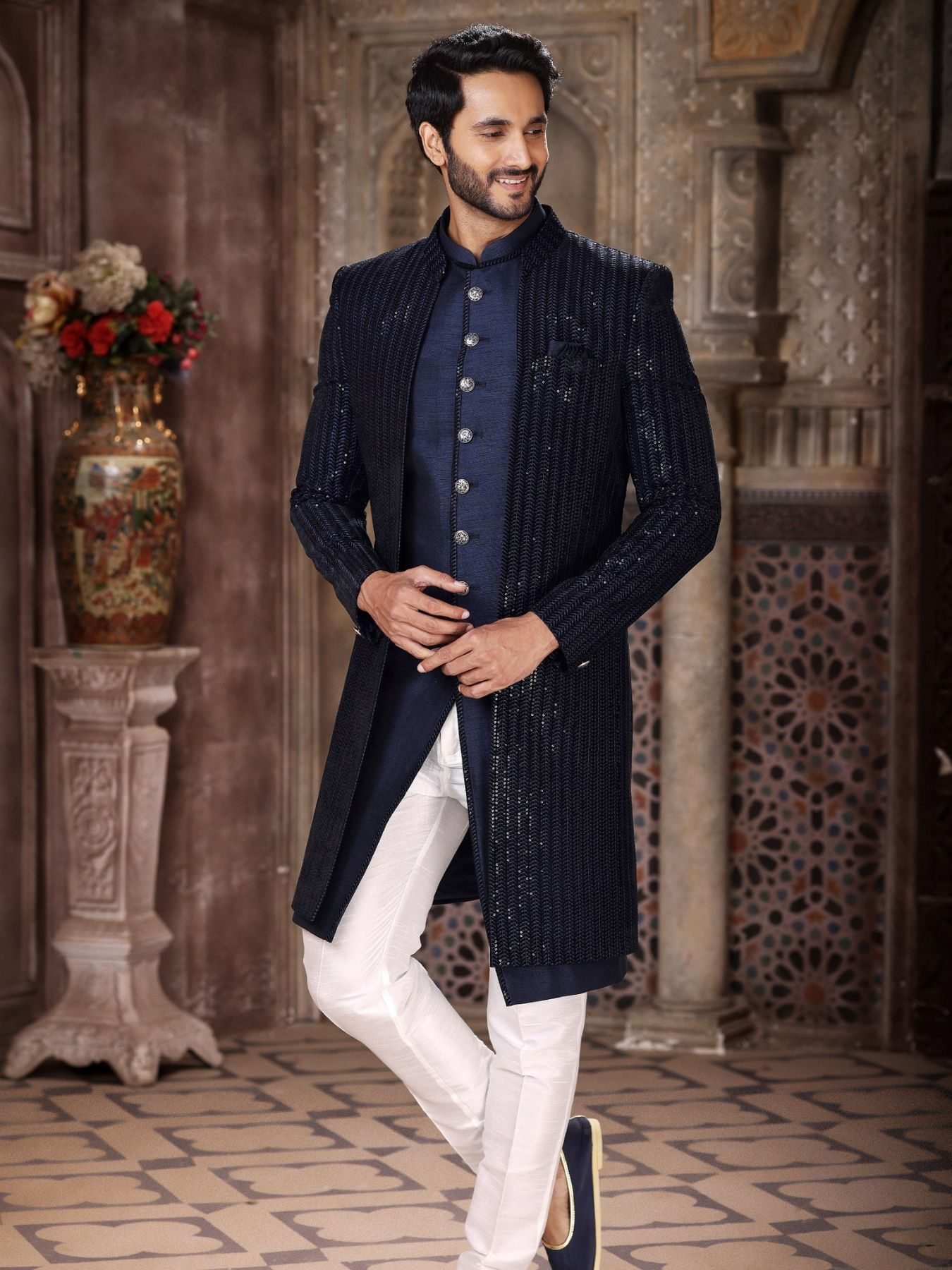 Premium 3 piece indo western jacket set crafted in art silk, velvet and banarasi jacquard fabrics with multiple designer variants. Comes with stylish jacket, kurta and aligarhi pant, perfect for wedding and festive wear.