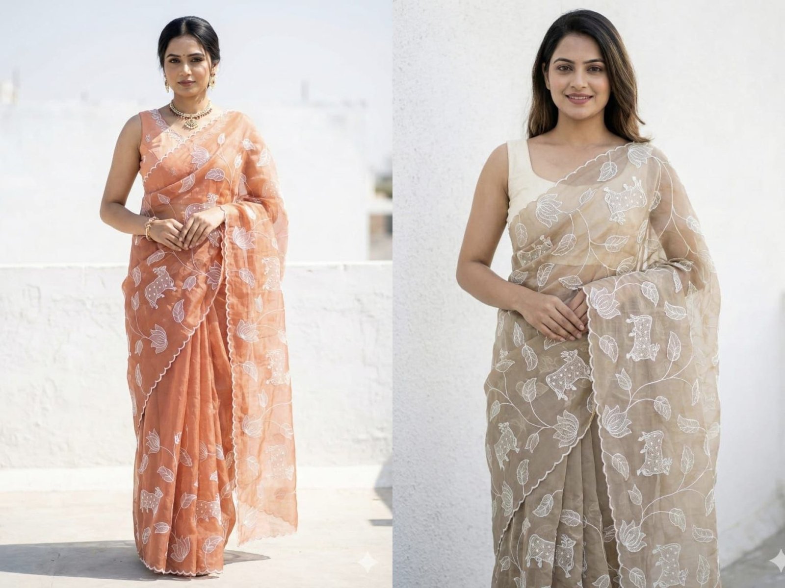 Elegant soft gold crush saree featuring heavy embroidery work on border and pallu with matching embroidered blouse. Lightweight and stylish, perfect for festive, party, and wedding occasions.