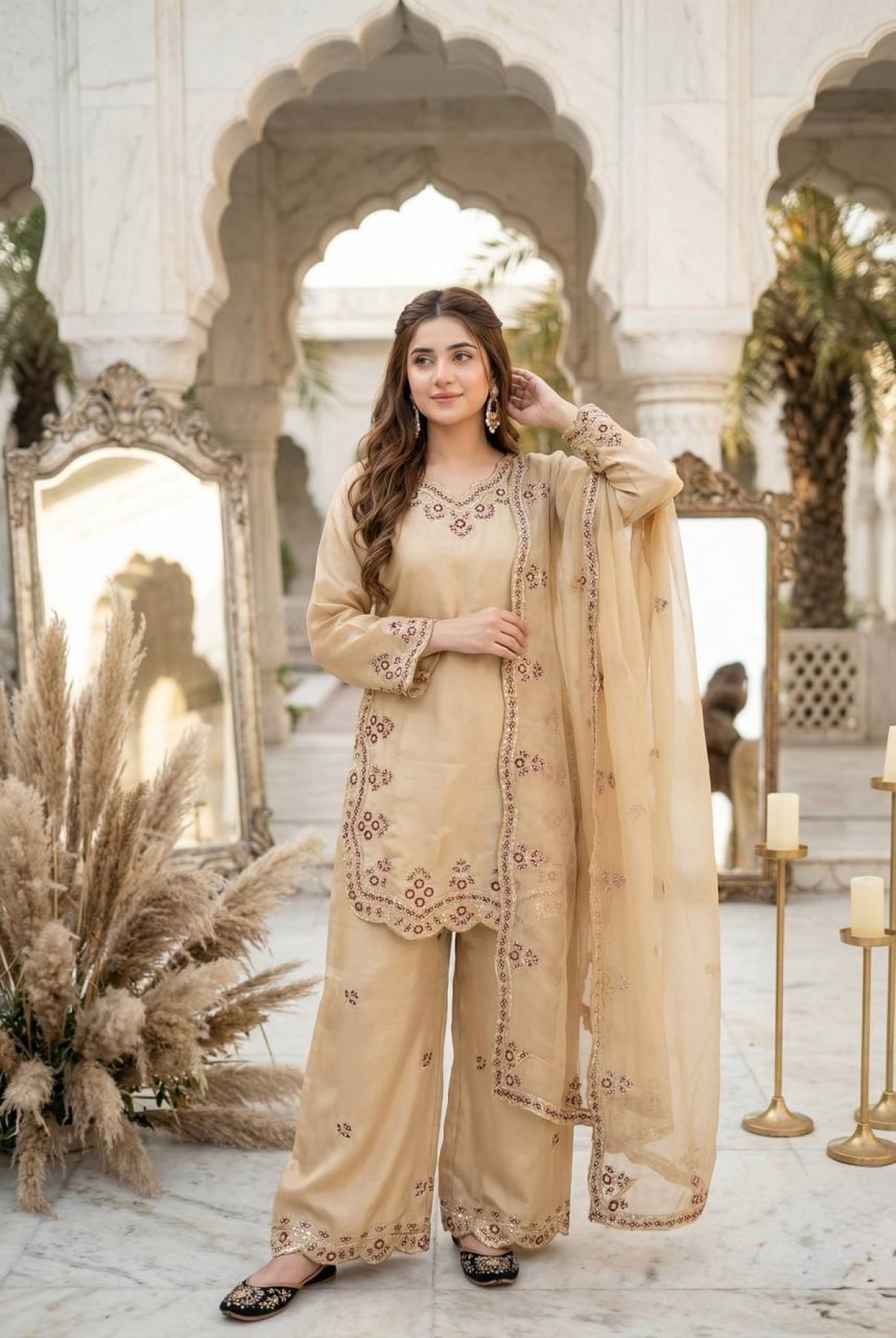 Size ChartStep into a luxurious and viral festive look with this premium roman glass set featuring heavy embroidery sequence work with elegant cutwork detailing. Designed with a stylish top and paired with a fully embroidered palazzo and a graceful georgette dupatta, this outfit offers a perfect blend of richness and modern ethnic elegance, ideal for weddings, parties, and festive occasions.
