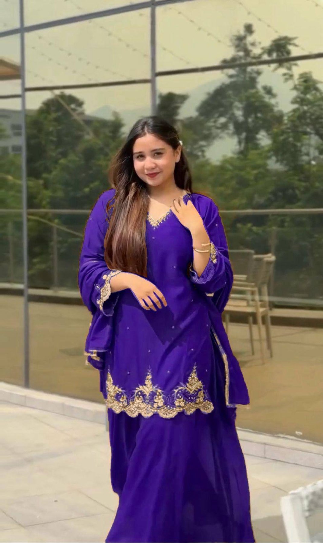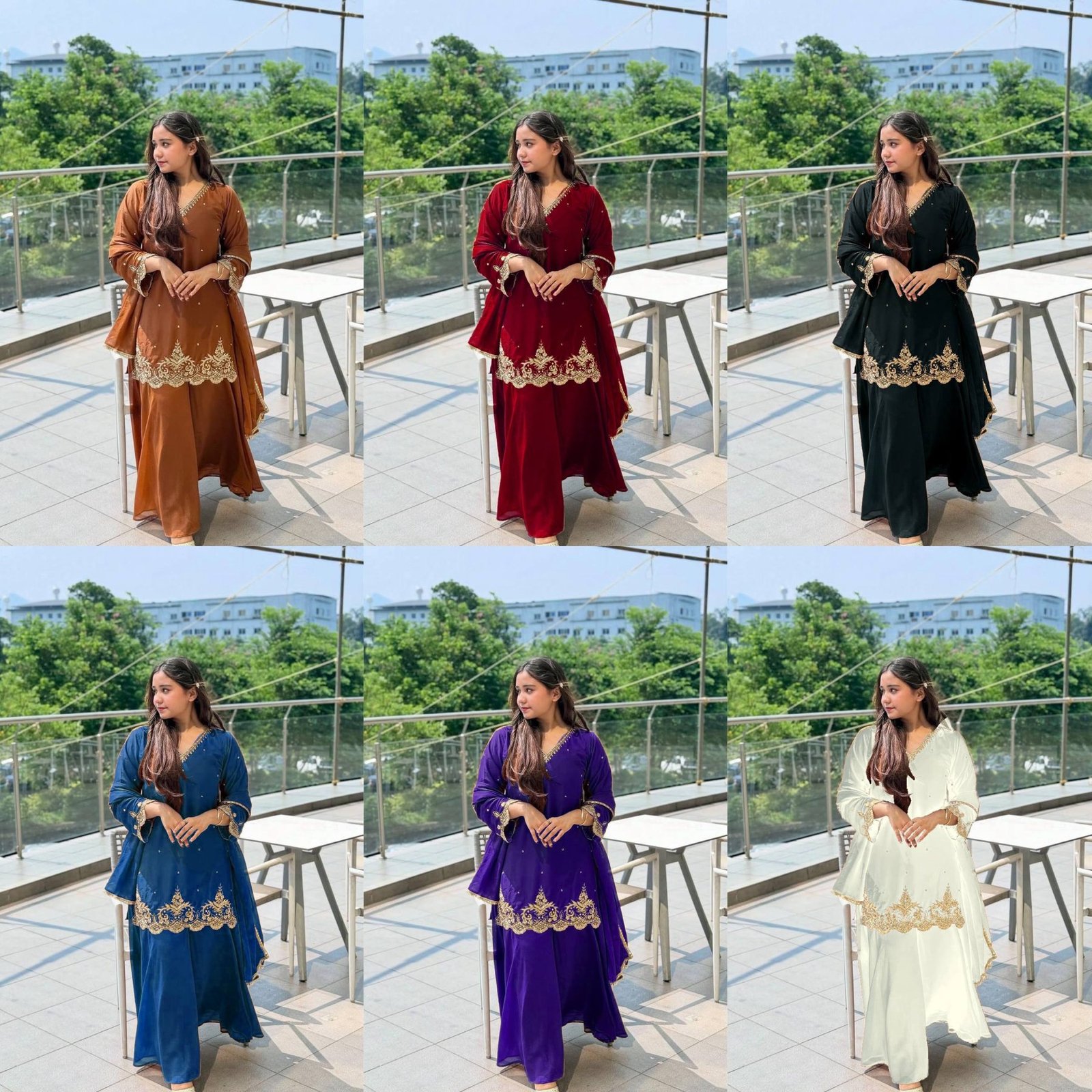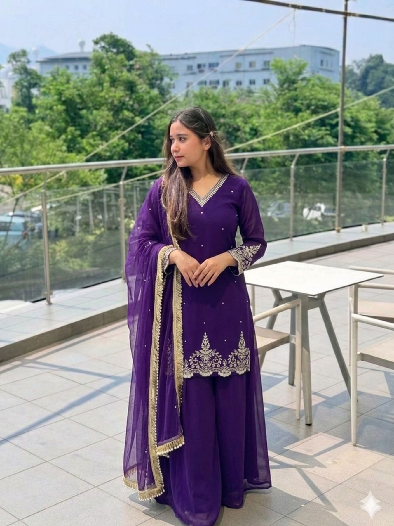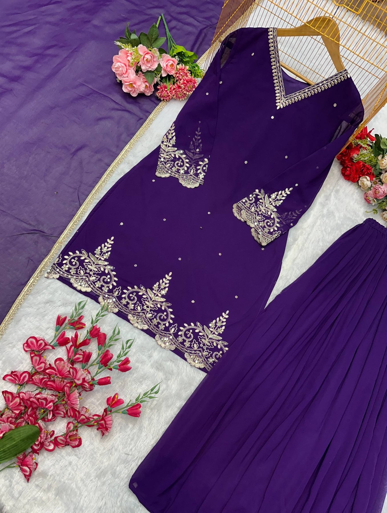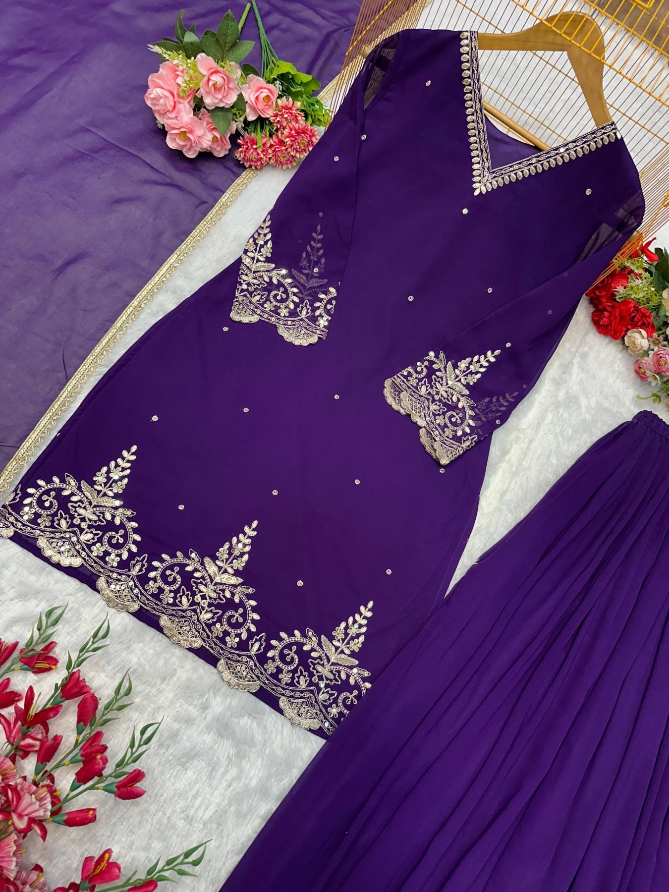 Elegant fox georgette suit set featuring beautiful embroidery work on top, paired with comfortable plazzo and stylish lace border dupatta. Perfect for festive, daily wear, and budget-friendly party wear with a classy ethnic look.