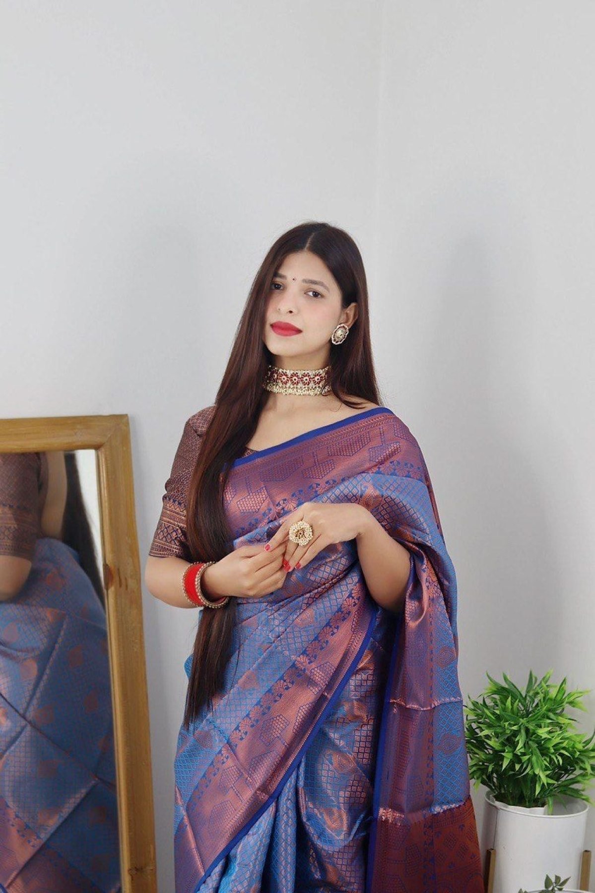 Pattu kanjivaram with all over heavy Copper zari work on body with a perfect contrast border with a super rich pallu with a full zari brocade blouse