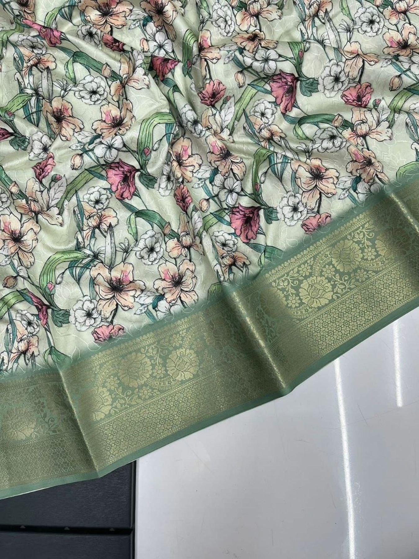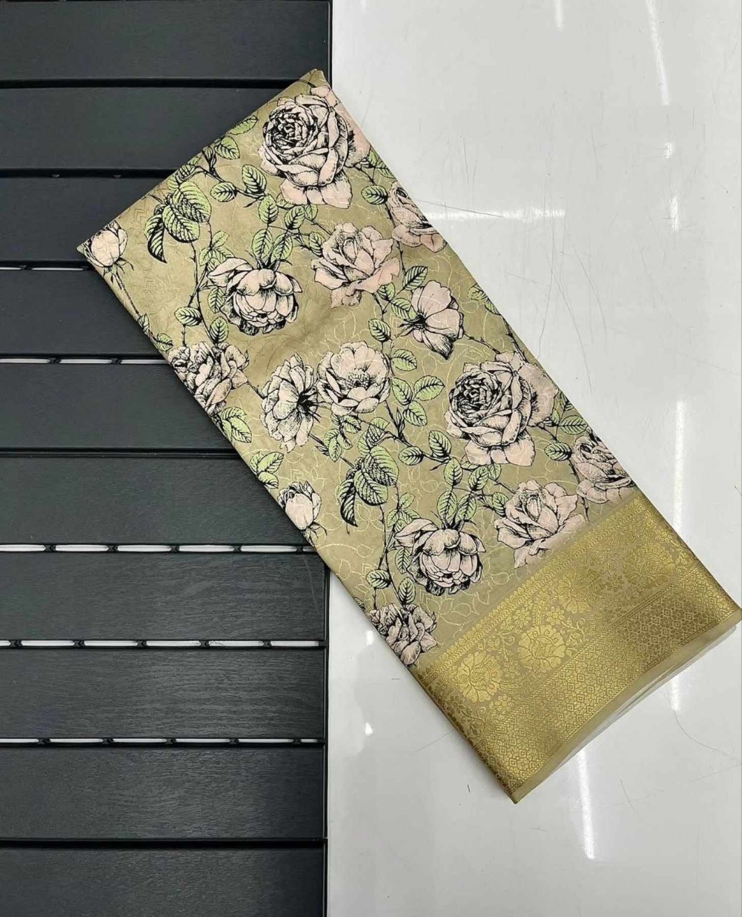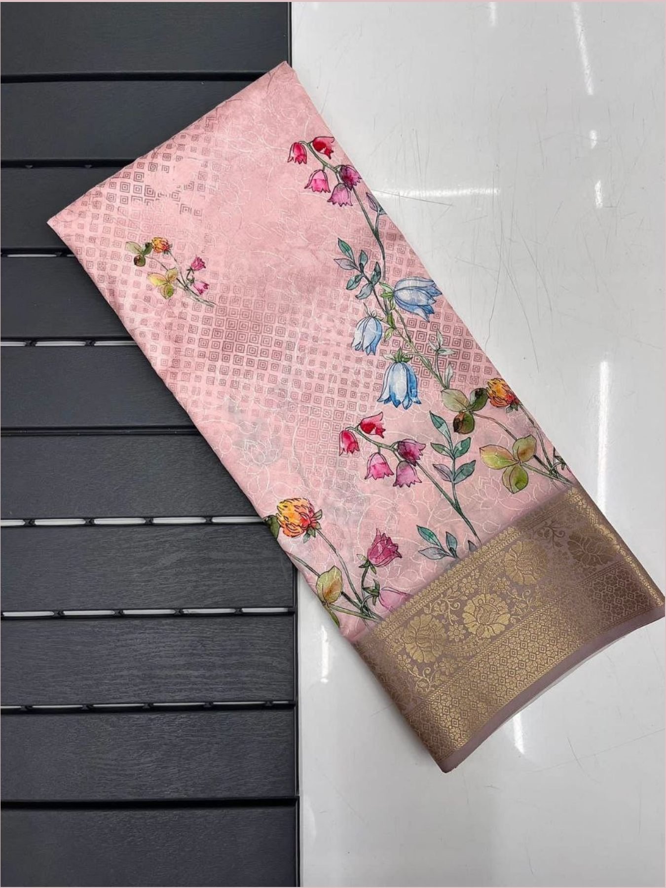 Pure soft silk sareee with self weaving. All over with beautiful prints and rich weaved pallu and contrast blouse