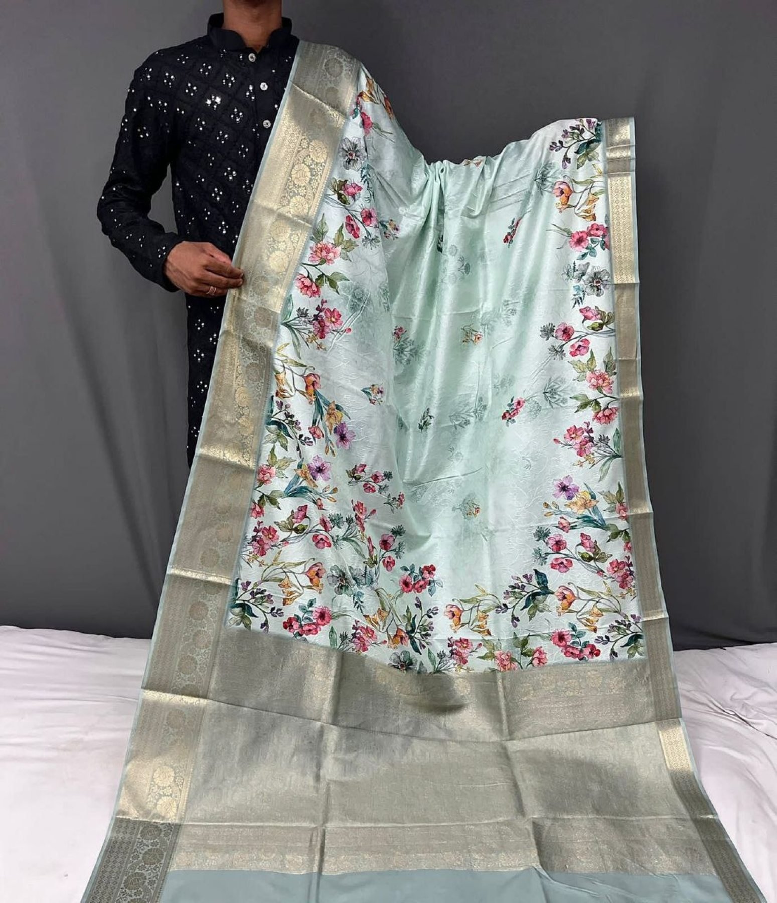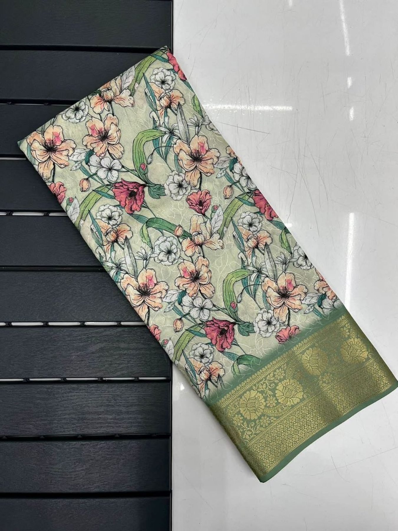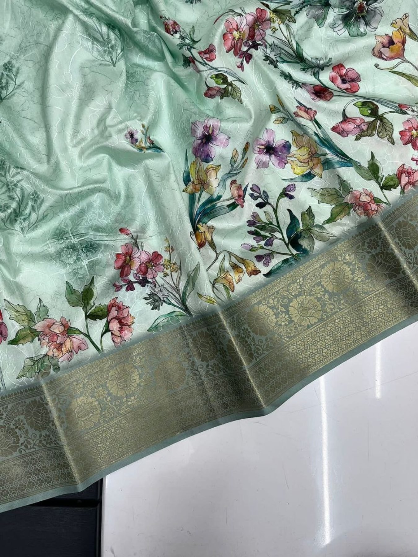 Pure soft silk sareee with self weaving. All over with beautiful prints and rich weaved pallu and contrast blouse