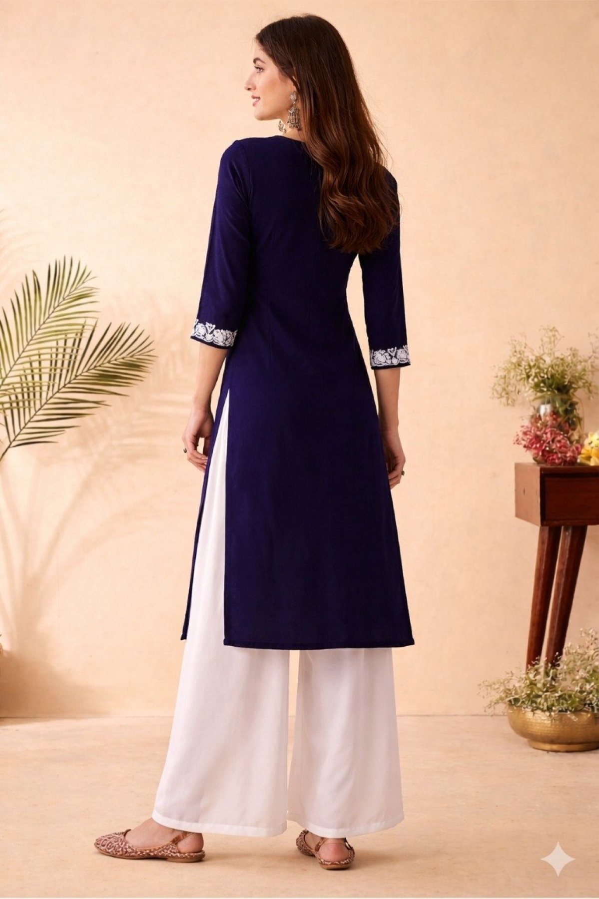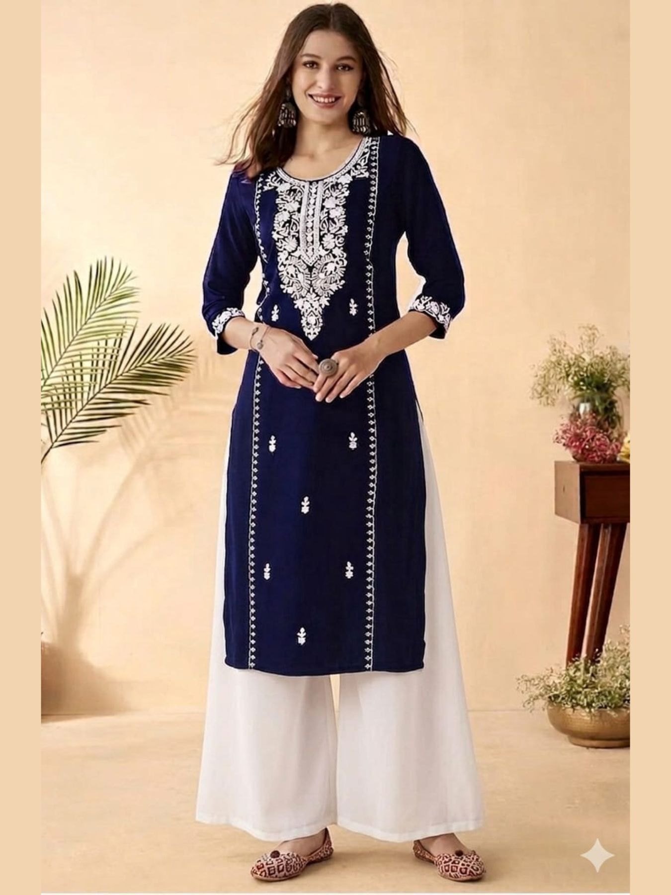 French crepe kurti palazzo set featuring beautiful embroidery work with a comfortable and flowy fit. Lightweight and stylish, perfect for daily wear, office wear, and festive occasions.