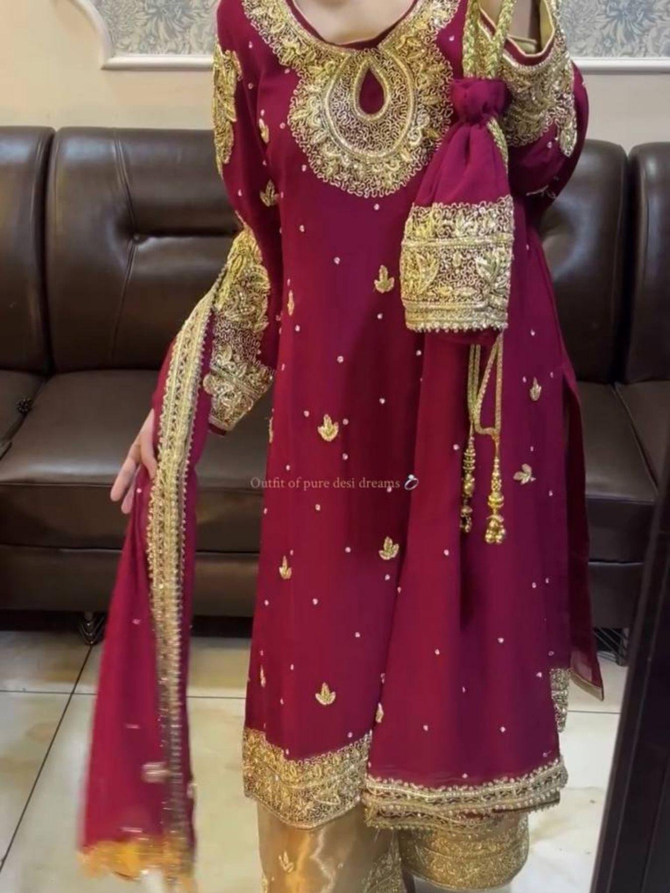 A ready-to-wear designer outfit that blends luxury embroidery, comfort, and festive charm — your perfect pick for weddings, receptions, or grand parties.