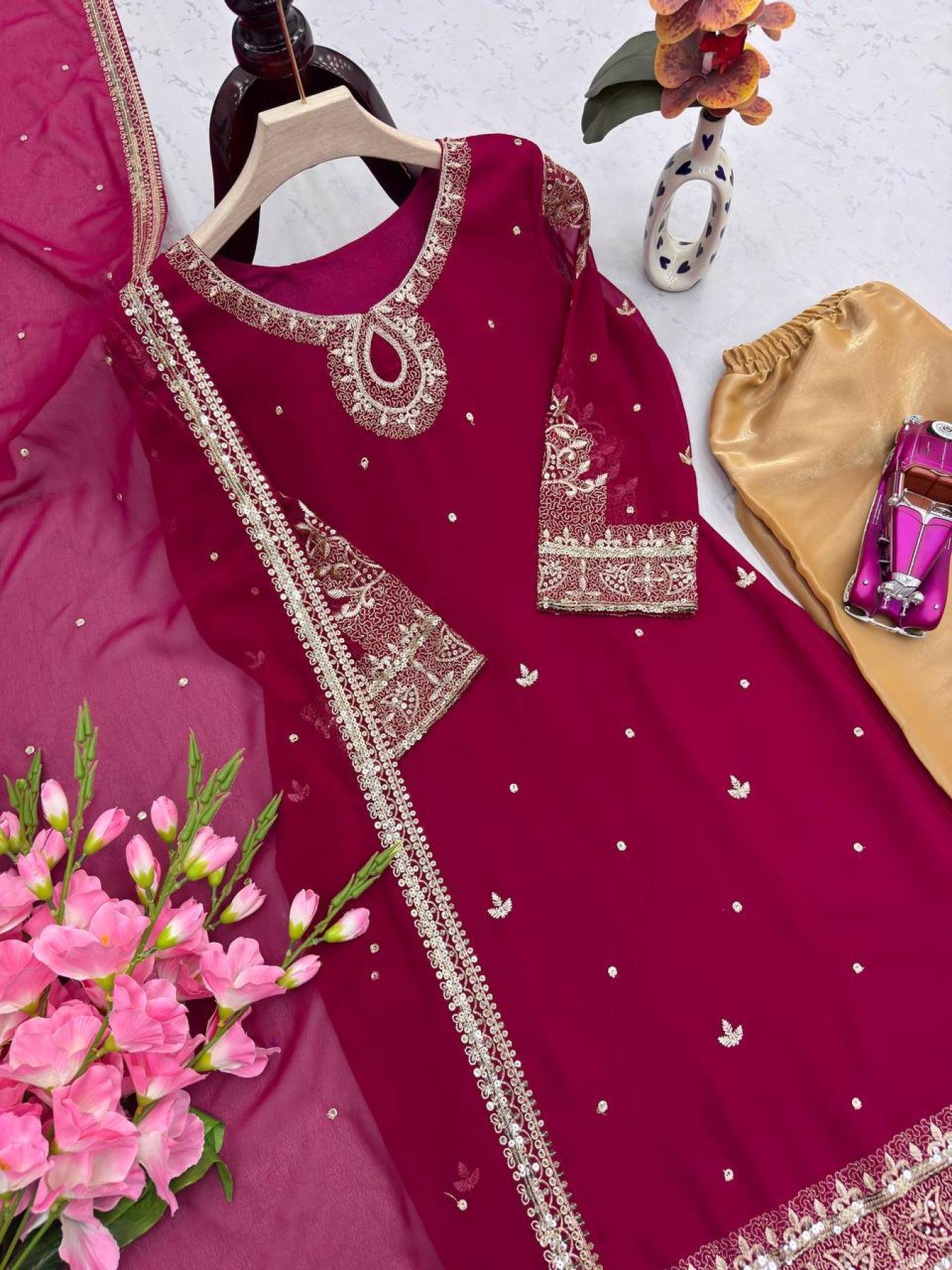 Turn heads at every event with this premium designer party wear ensemble, crafted to deliver glamour and grace. Made from heavy Fox Georgette and Gmy Silk, the outfit features exquisite embroidery and sequins work for a luxurious festive look. This fully stitched set comes with a matching dupatta and a free designer handbag — perfect for parties, weddings, and celebrations.
