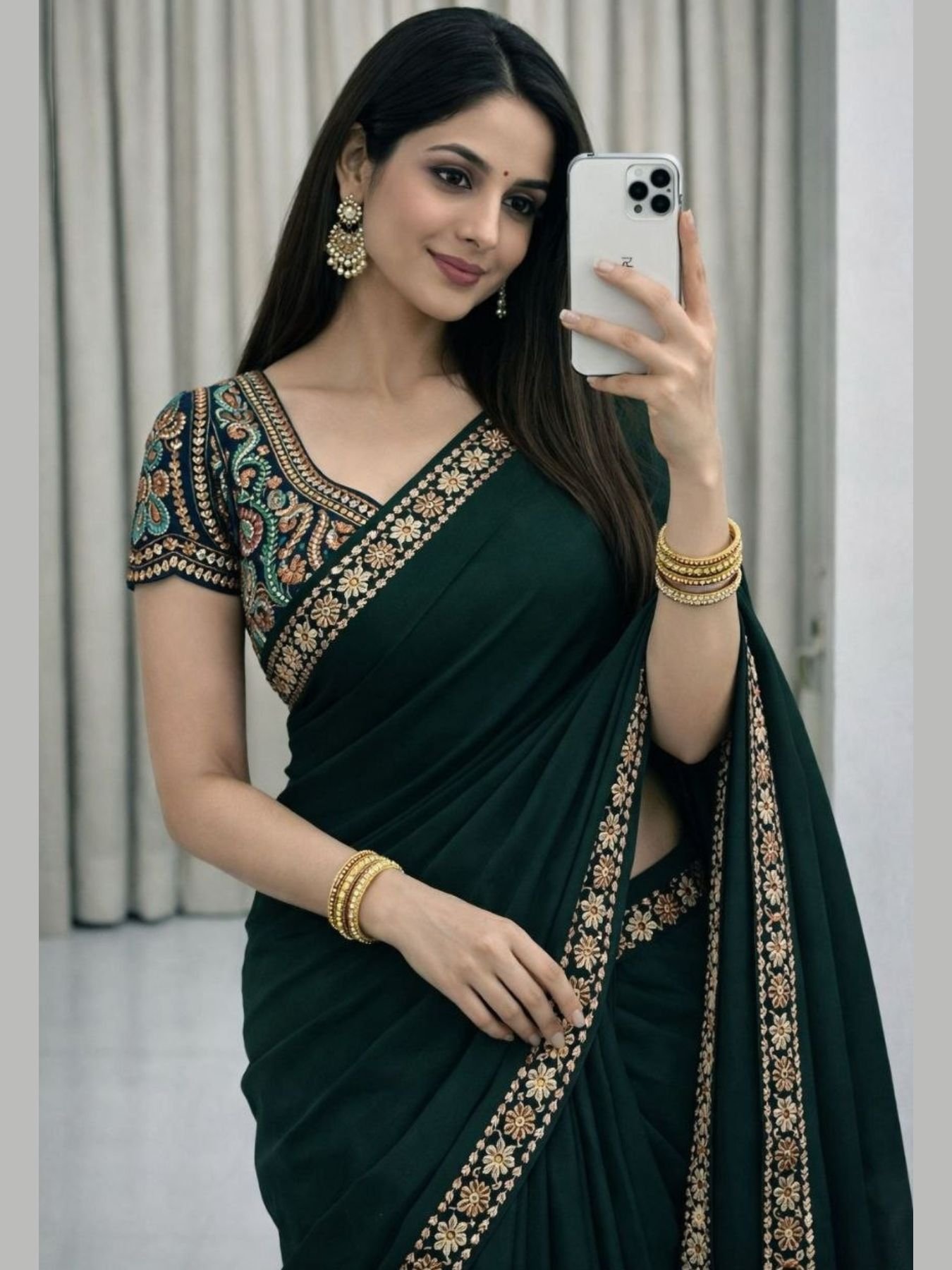 Latest Green Rangoli Silk Saree with Multi Work Blouse for Festive Wear