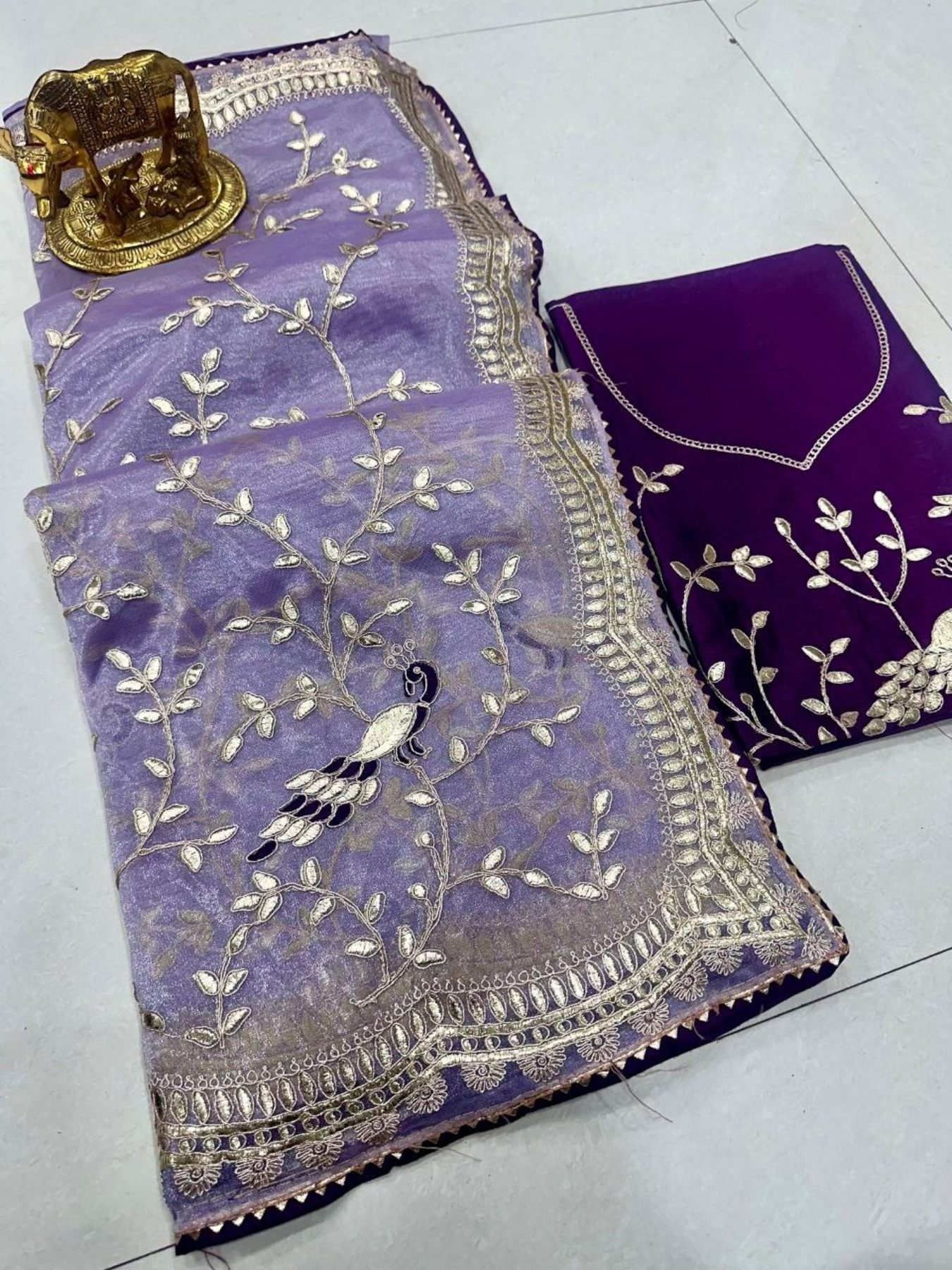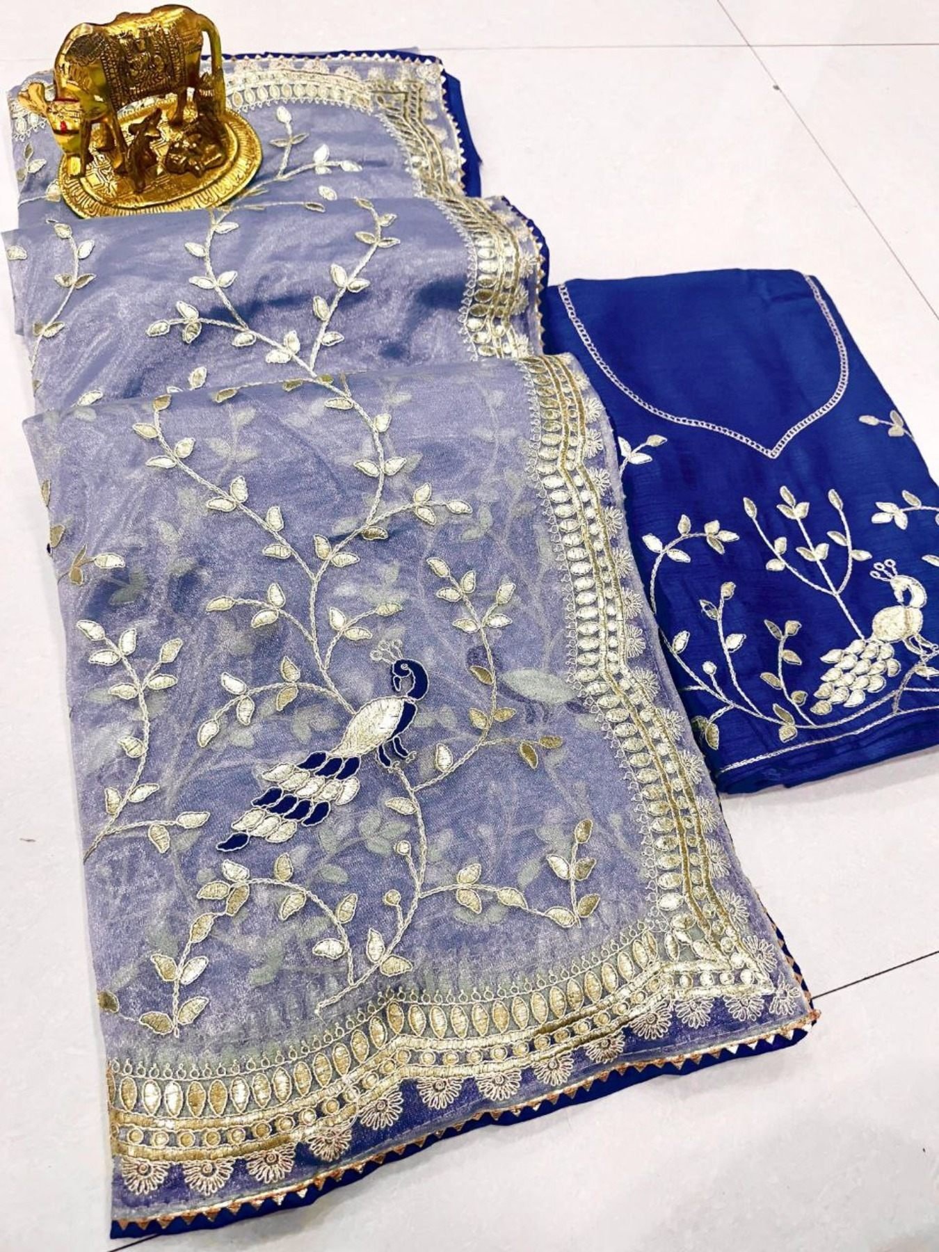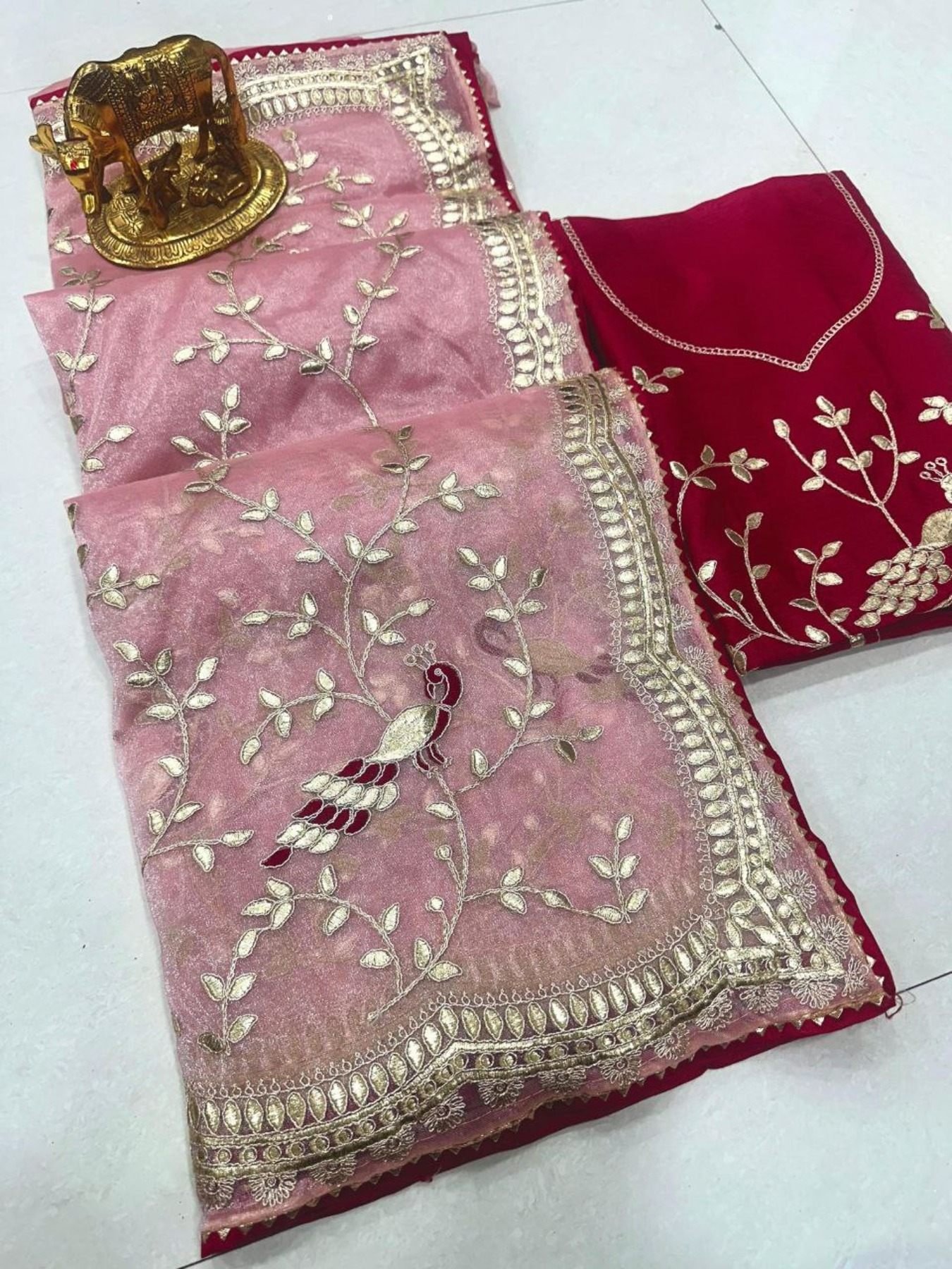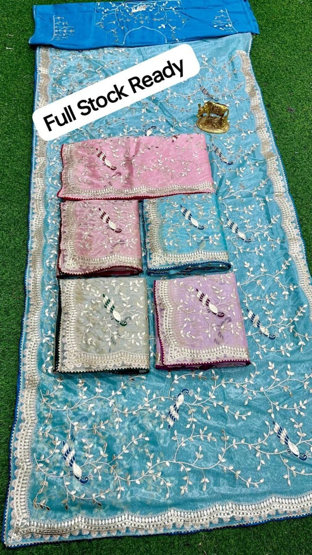 Pure Tissue Silk Saree In A Solid Color With Full Heavy C~Pallu Jaipuri Gota Work With Viscose Thread Work In Saree Paired With Blouse Of Contrast Color Of Saree With Jaipuri Gota Work With Viscose Thread Work In Blouse.