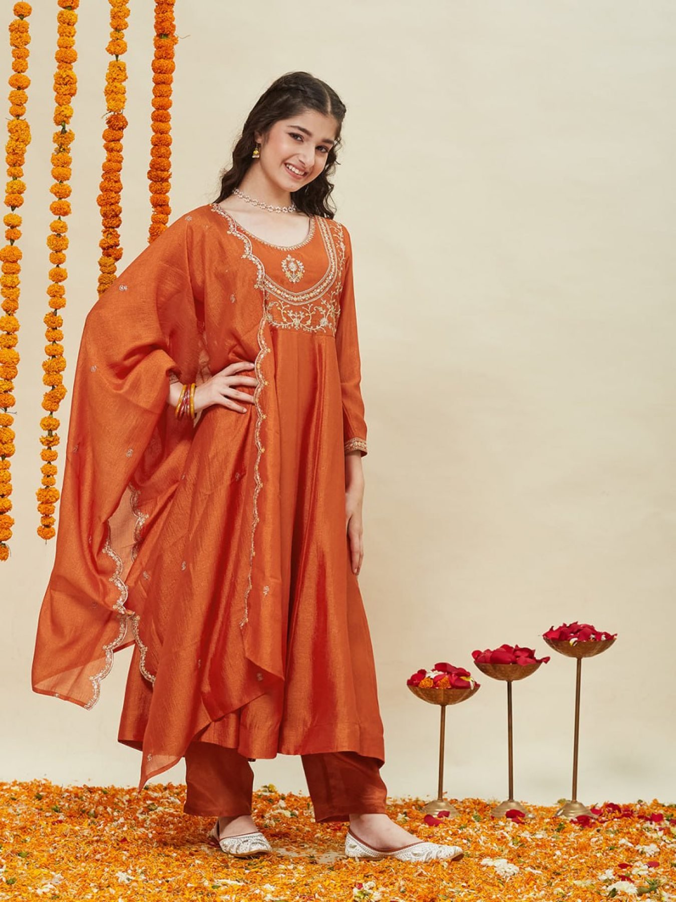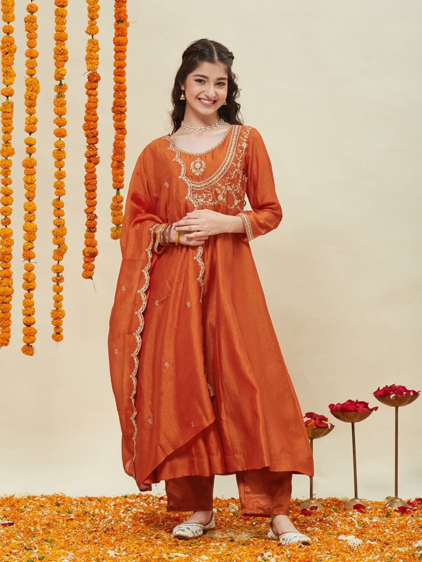 This attractive kids kurti pant set is crafted in premium silk blend fabric with elegant neck embroidery work. Designed with a soft micro cotton lining, it ensures maximum comfort for children during long festive wear. The matching embroidered dupatta enhances the ethnic look, making it perfect for weddings and celebrations. Available at wholesale and manufacturer rates for resellers and exporters.