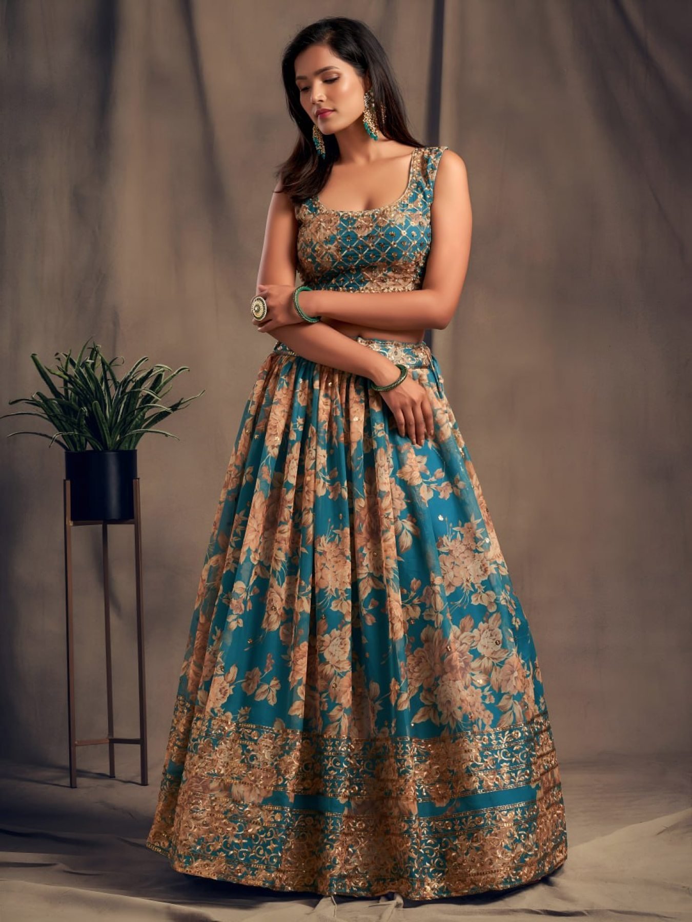 Elegant floral printed organza lehenga set enhanced with sequins and zari embroidery work. Paired with matching blouse and dupatta, this graceful ensemble is perfect for weddings, festive functions, and special occasions.