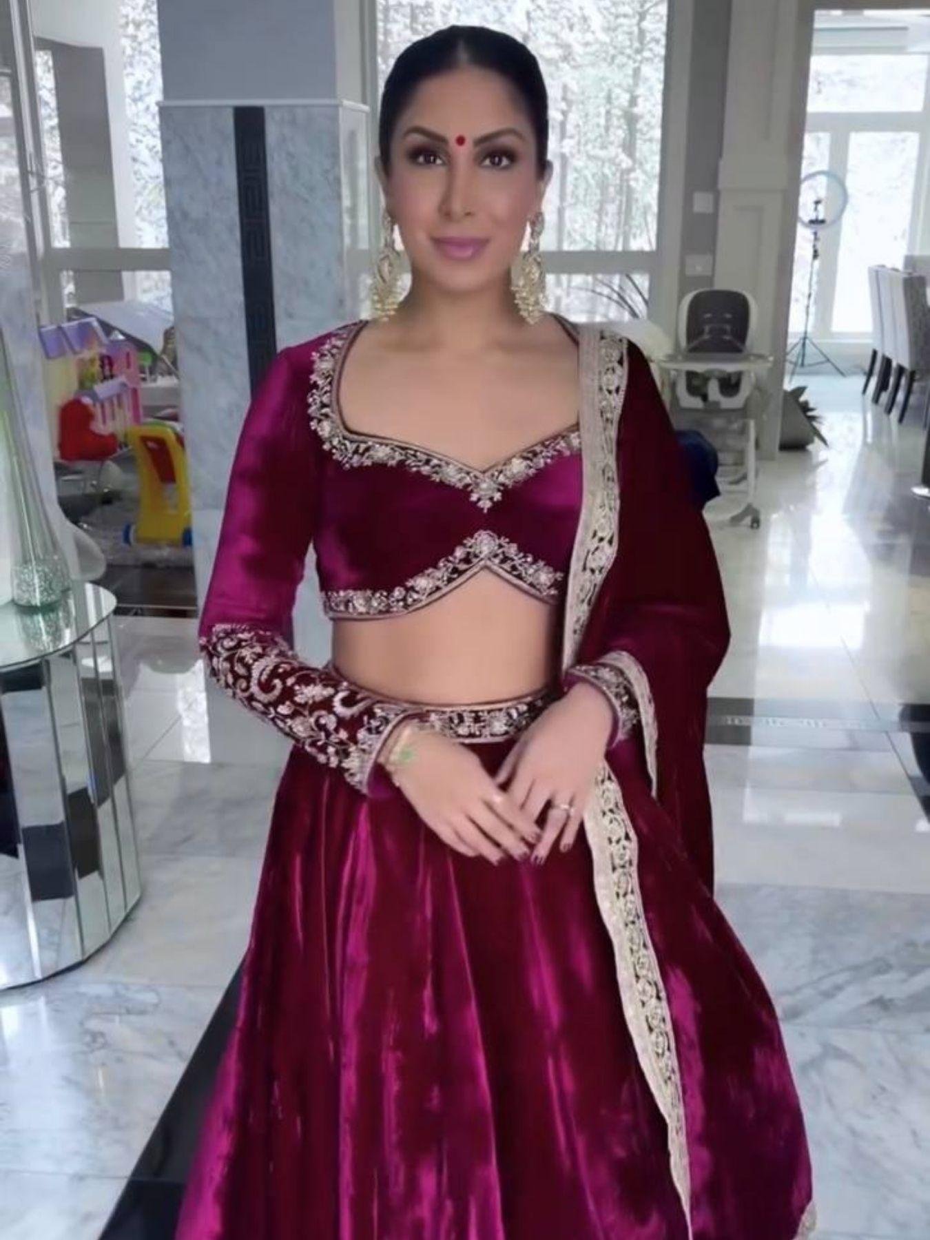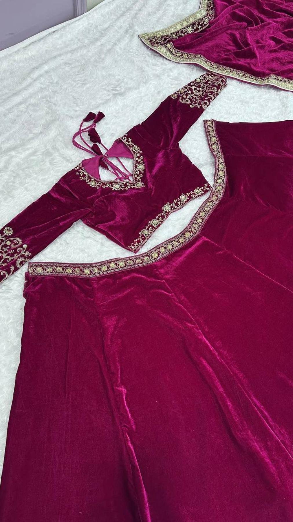 Lavish Wine Color Velvet Lehenga Choli with Sequins, Dori and Zari Work