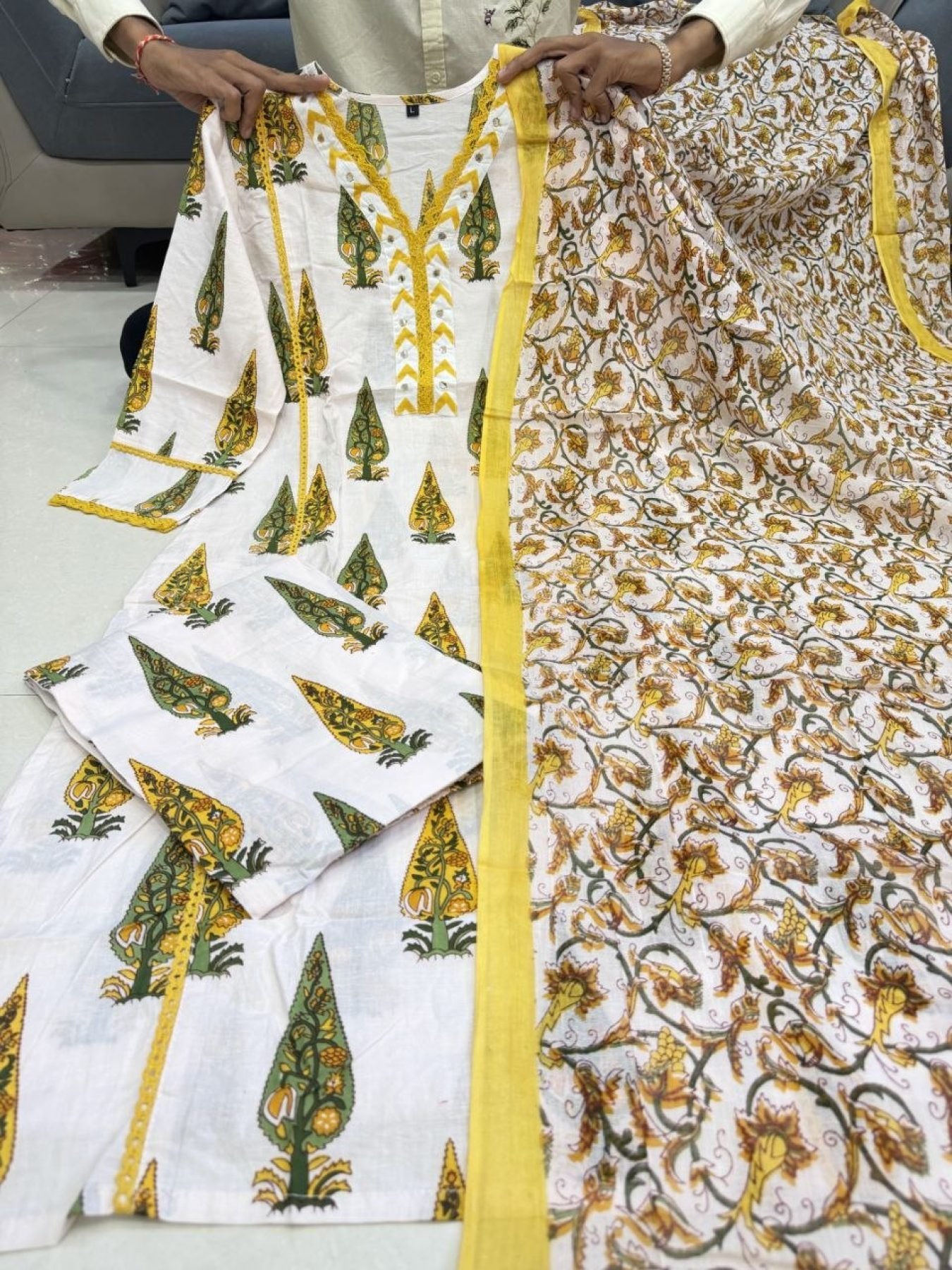 Premium Jaipuri cotton suit set with authentic Bagru print and elegant mirror work neck. Lightweight, breathable and perfect for daily and ethnic wear.