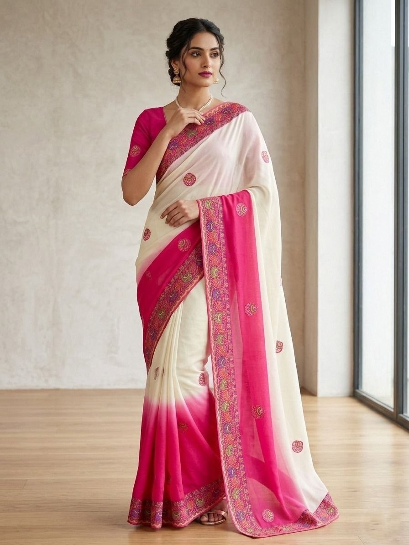 Sophisticated dual-tone star georgette silk saree featuring 3D print with rich pallu and multi-colored embroidered border paired with contrast blouse. Perfect for festive and elegant day wear.