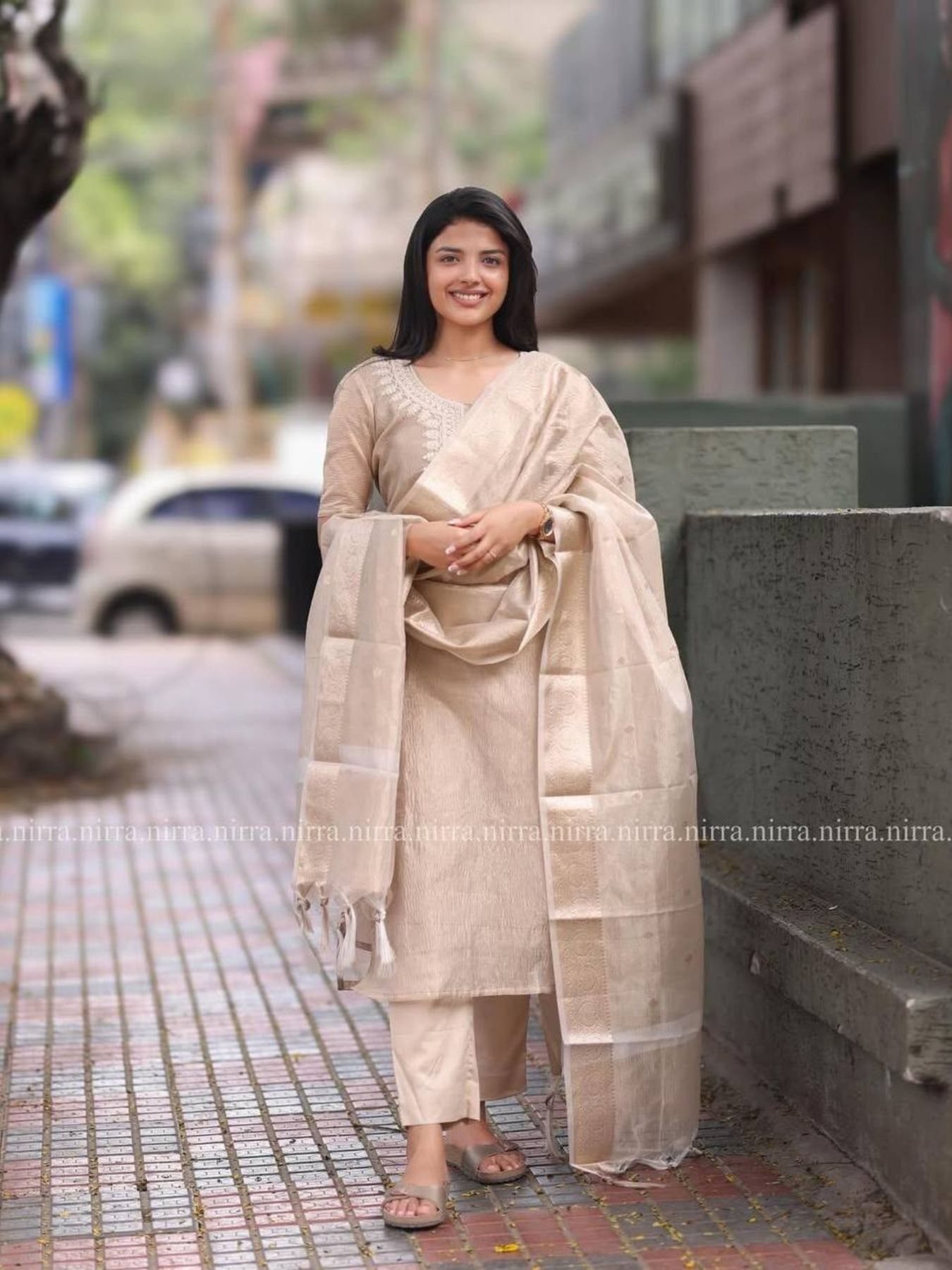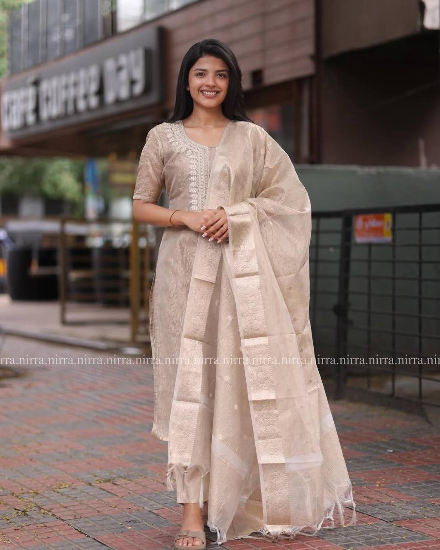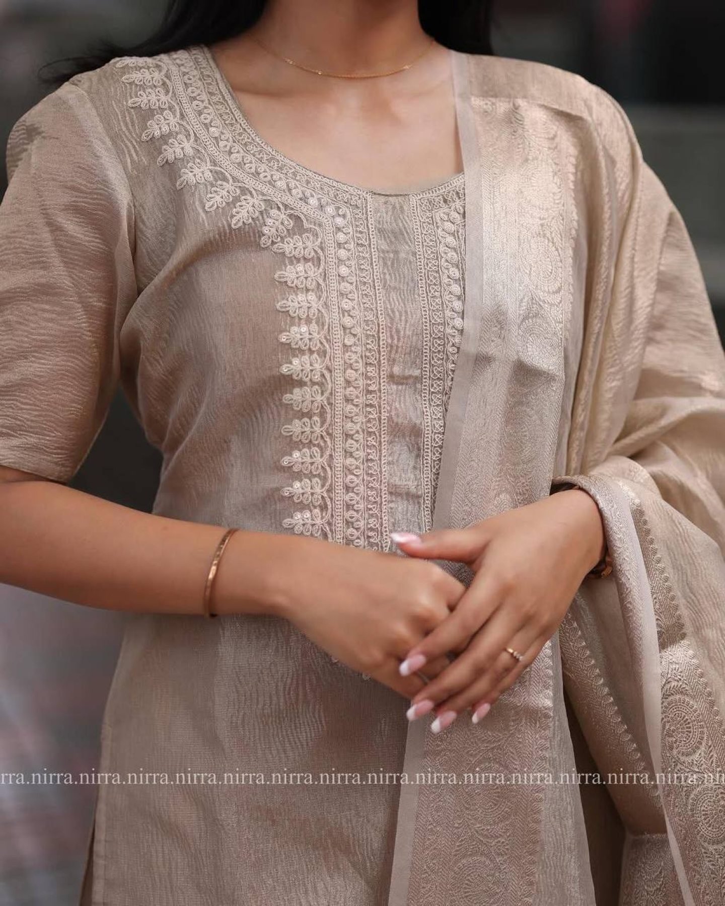 Size ChartStep into sophistication with this beautiful three-piece set, featuring a Kurta, Salwar, and Dupatta. Designed in a muted light brown shade with delicate embroidery and shimmering foil work, this outfit is perfect for festive occasions, casual outings, and celebrations.