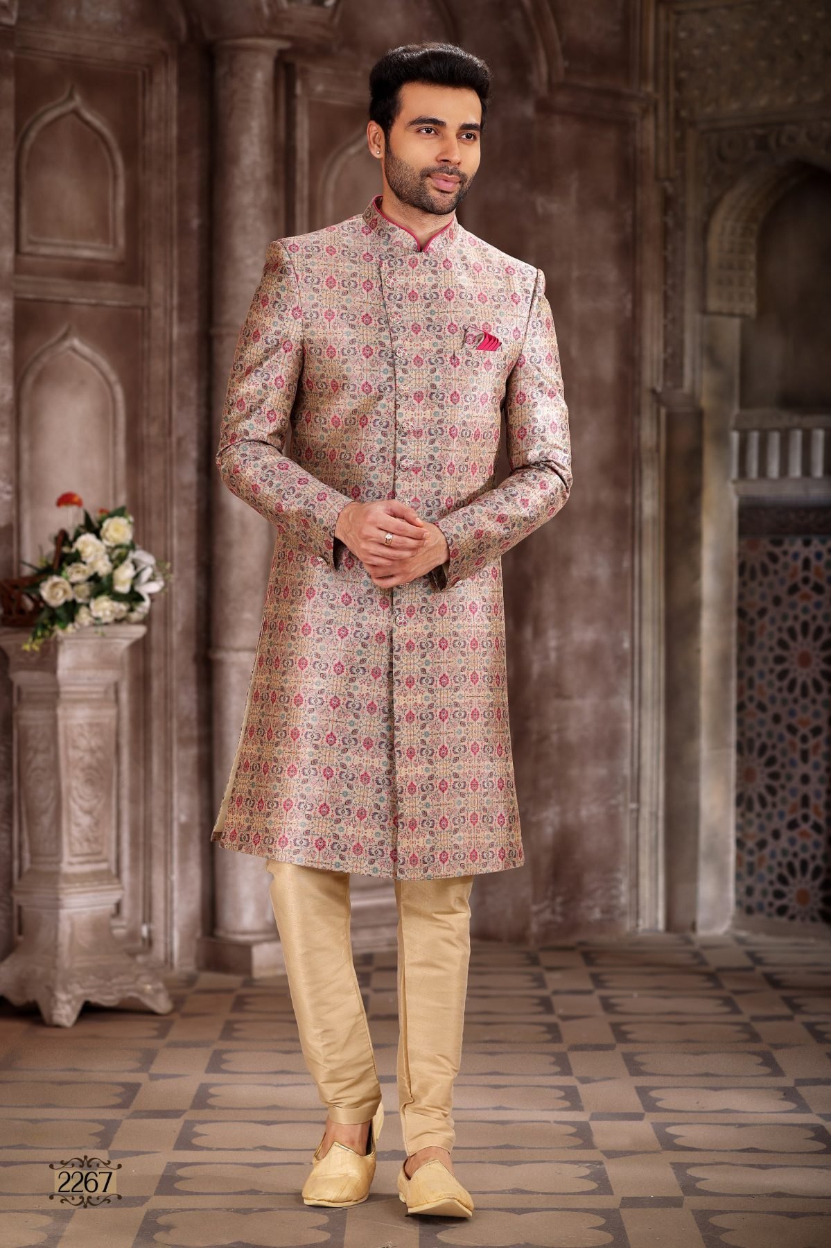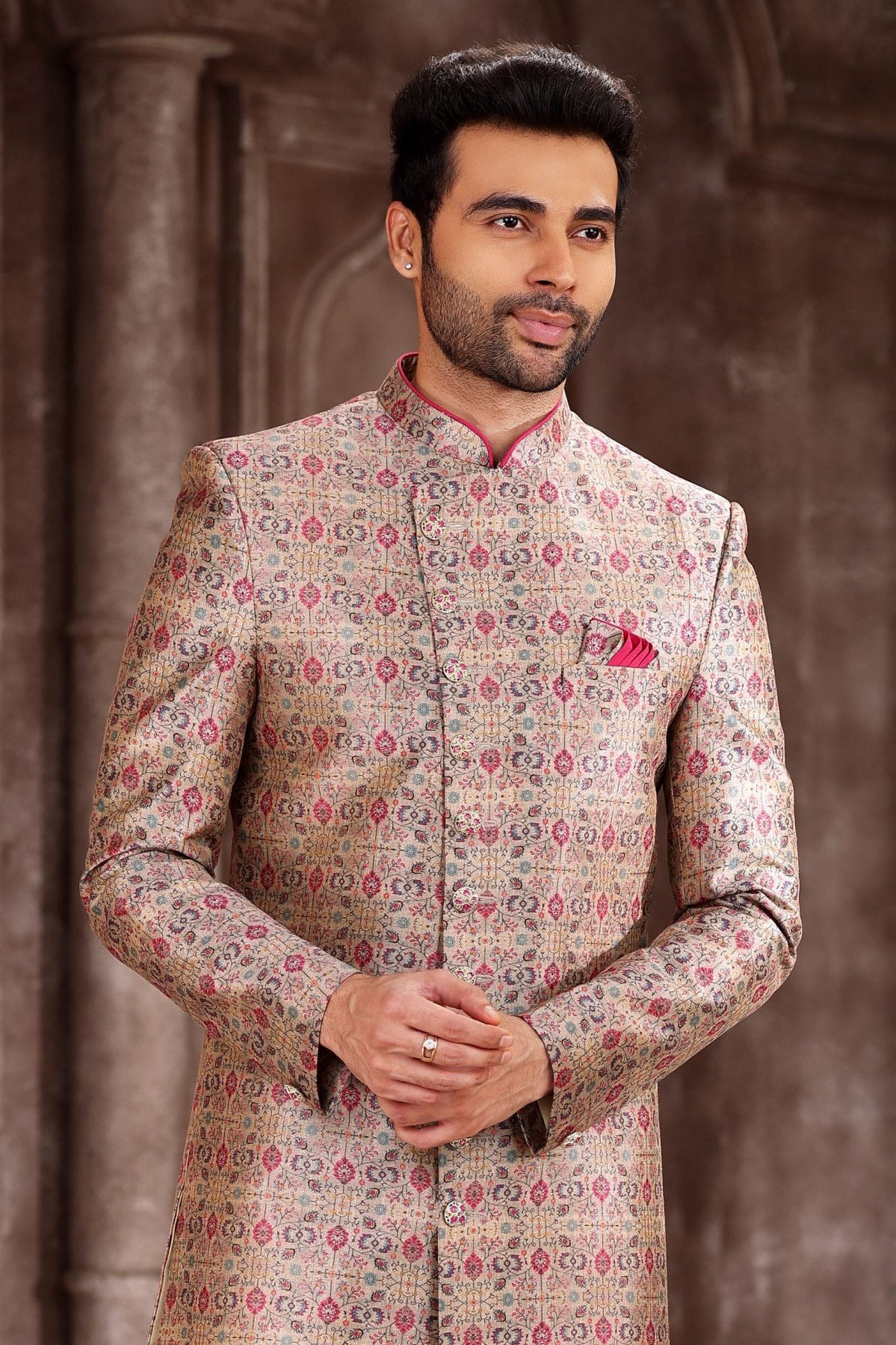 Premium dupion art silk sherwani set with designer printed pattern and chudidar bottom. Perfect for weddings, parties, and festive occasions with a rich elegant look.