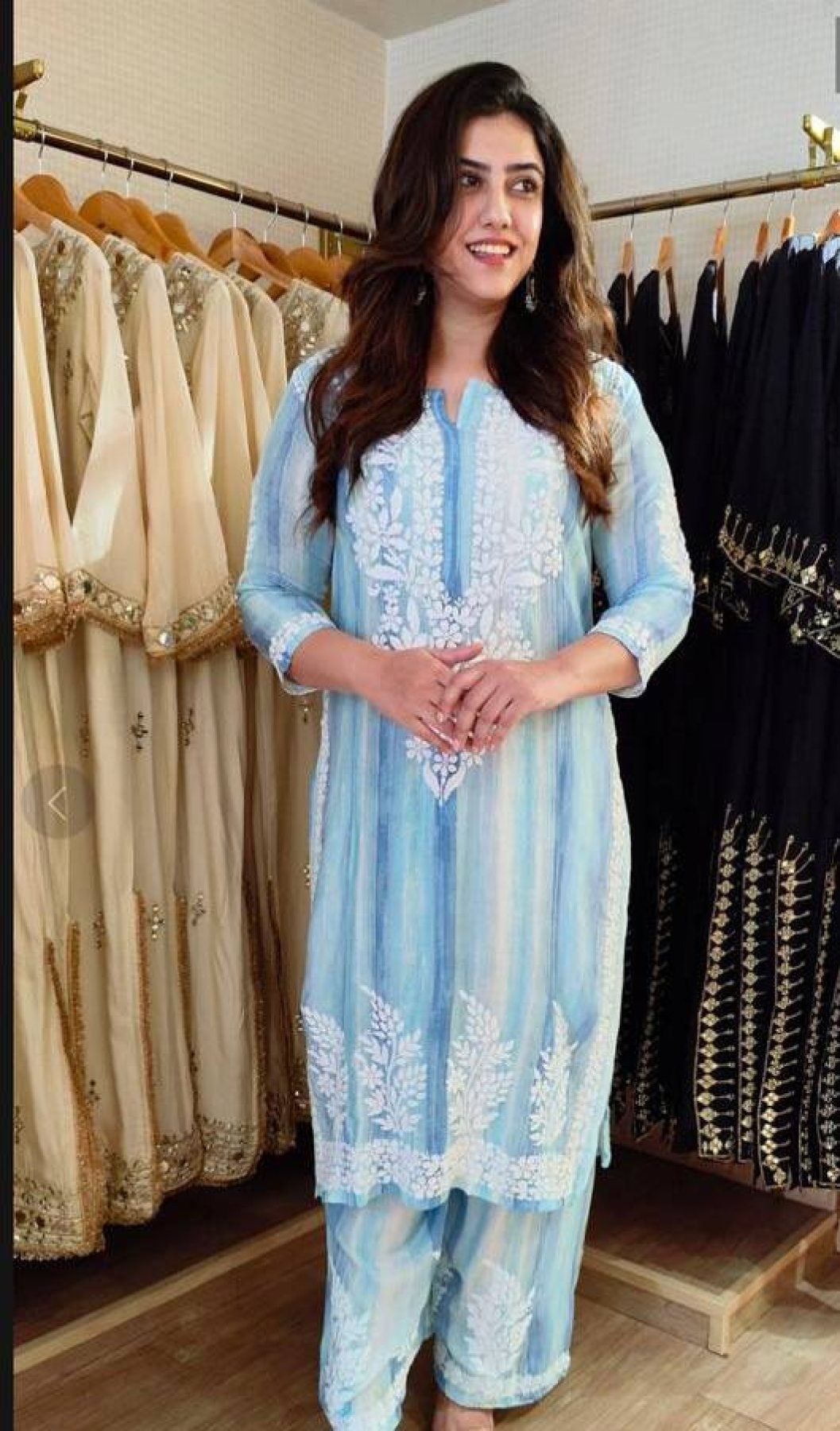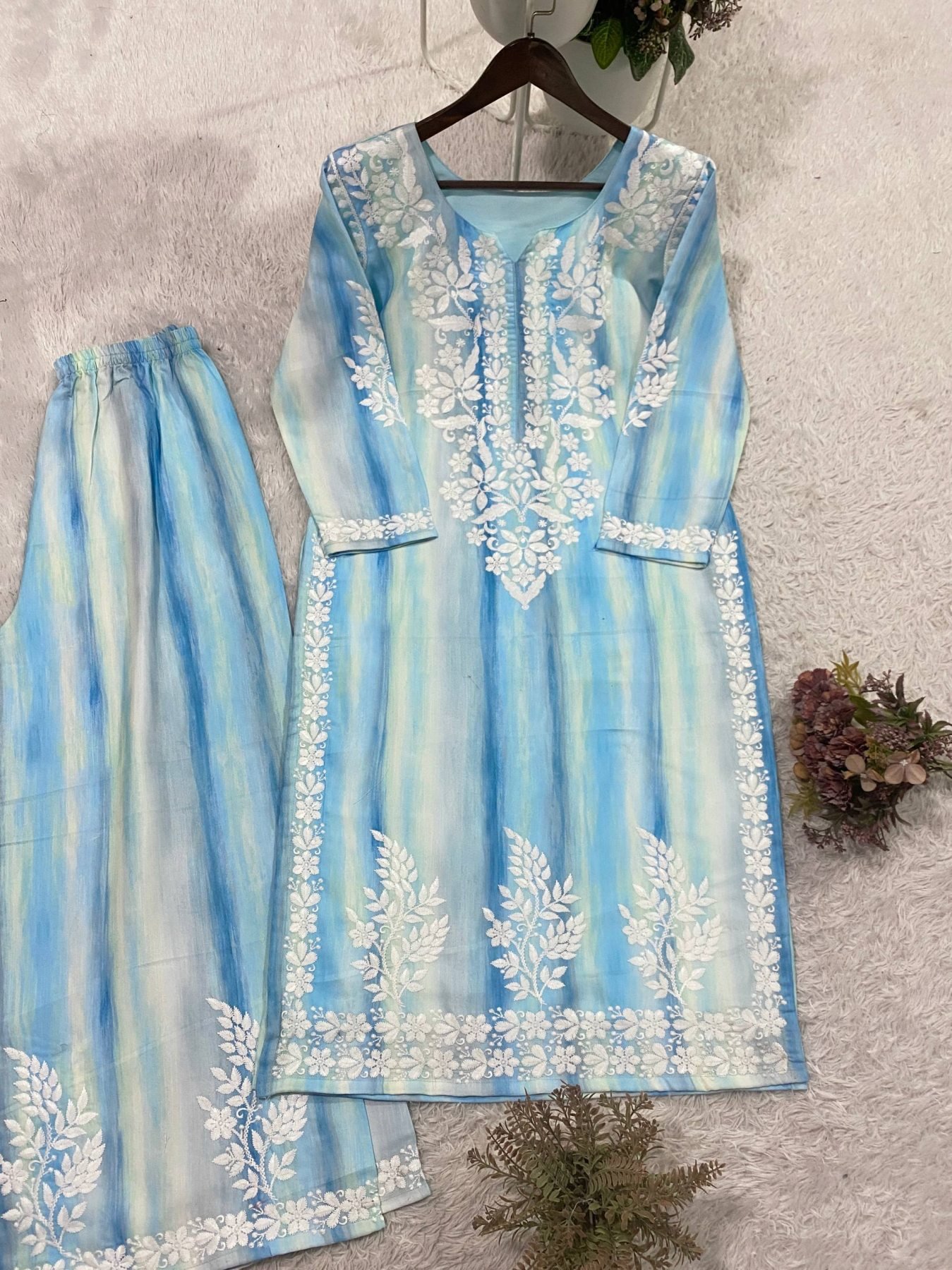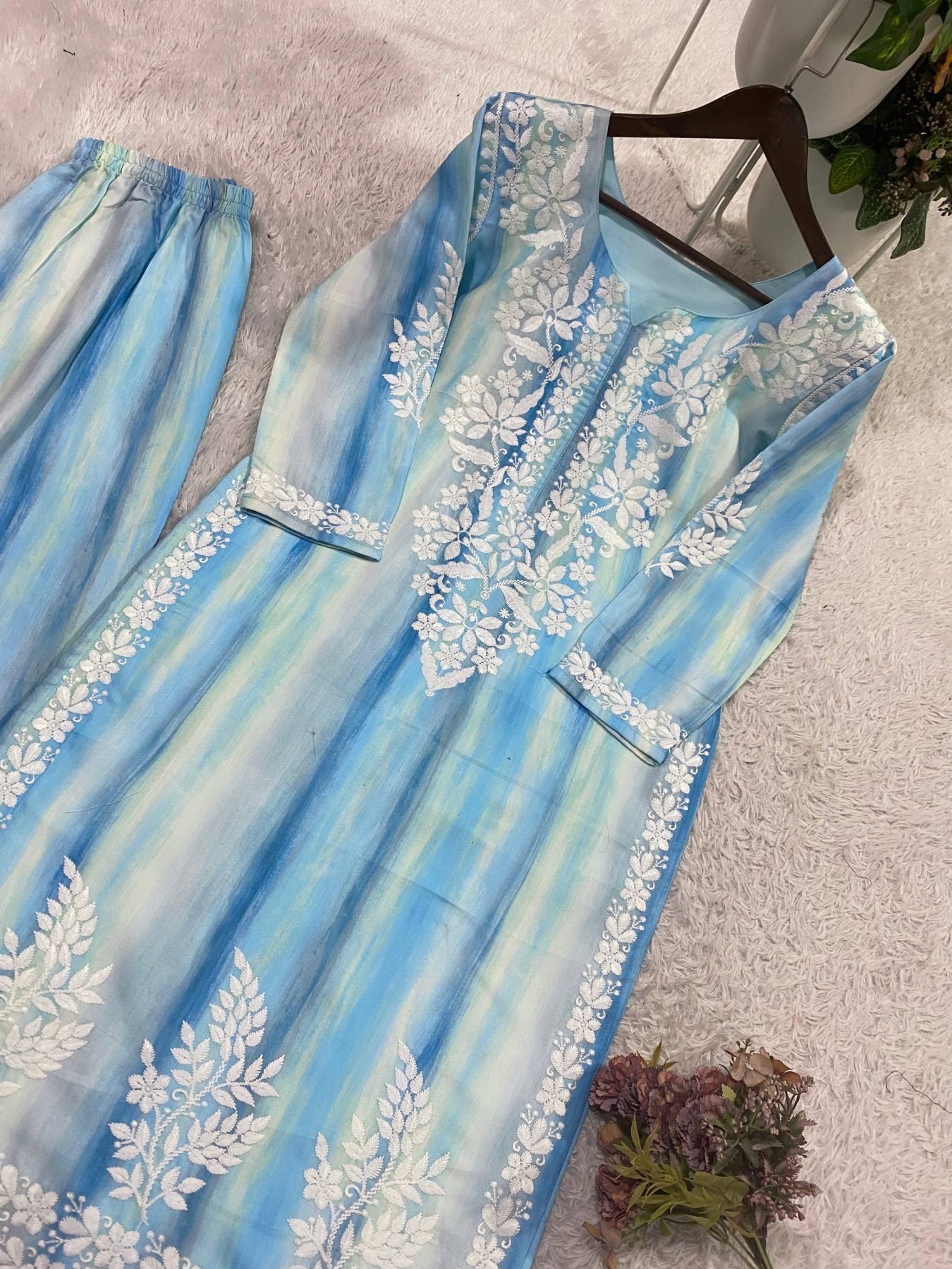 Stylish summer rayon embroidered co-ord set featuring elegant front and sleeve embroidery with matching embroidered palazzo. Lightweight and comfortable designer outfit perfect for casual, festive, and daily wear.