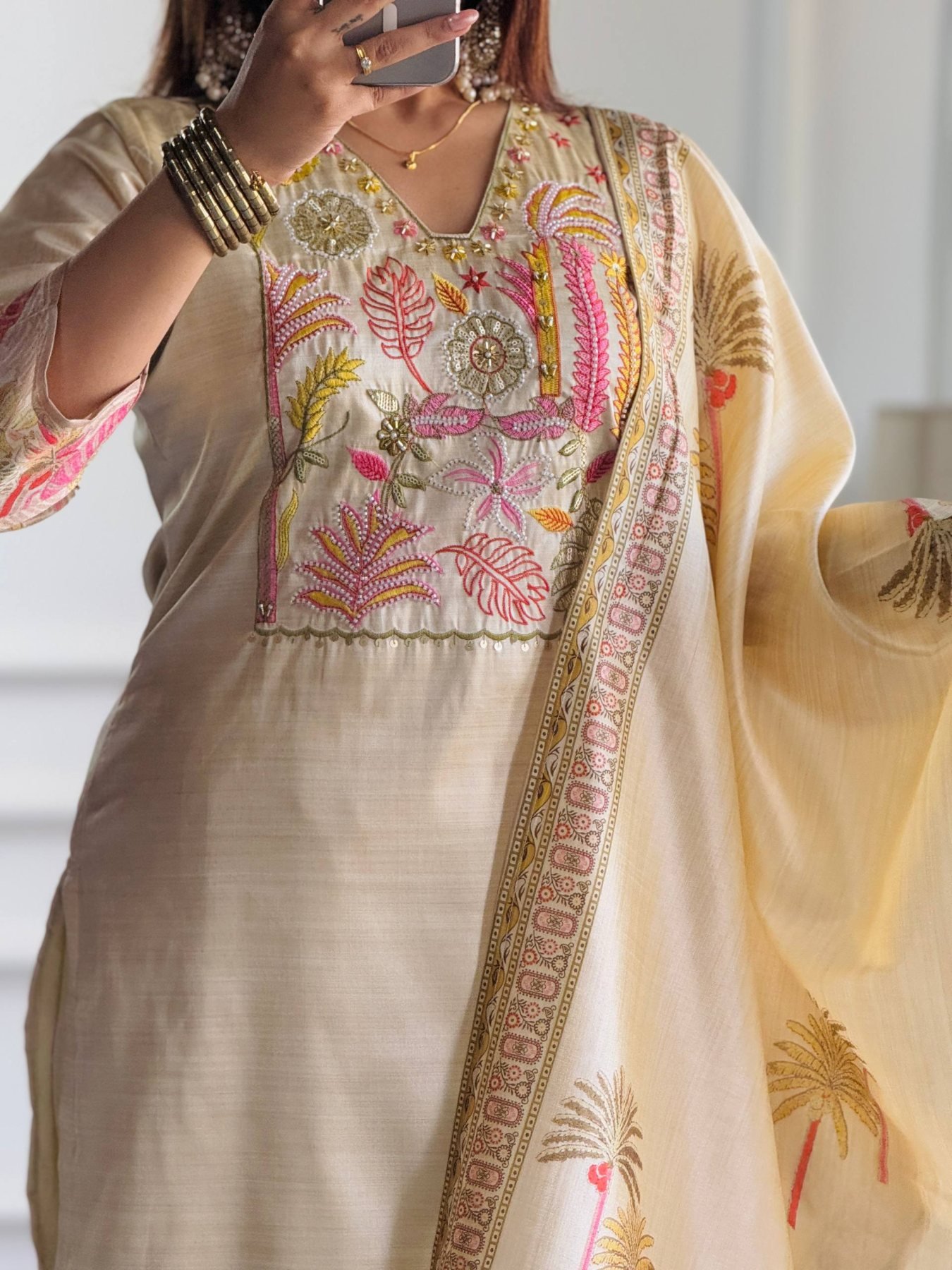 Lively Assam Silk Embroidered Top Pant Set with Digital Print Dupatta for Wholesale buyers