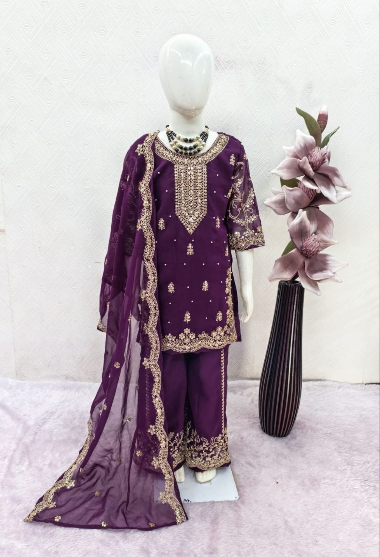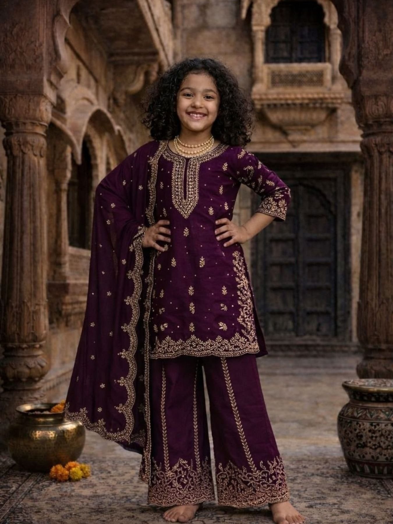 Premium kids kurti plazzo set crafted in georgette featuring heavy embroidery with sequins, coding, and moti work. Paired with a matching dupatta, this outfit is perfect for festive occasions, weddings, and party wear.