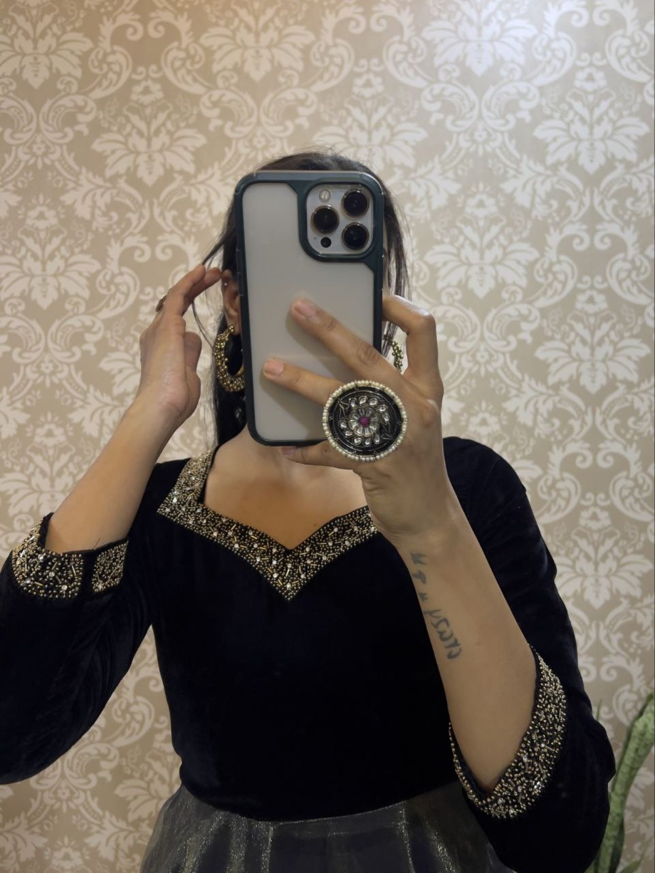 Premium 9000 Velvet paired with Soft Twill Tissue Silk, adorned with intricate Kardana Hand Work for a royal finish