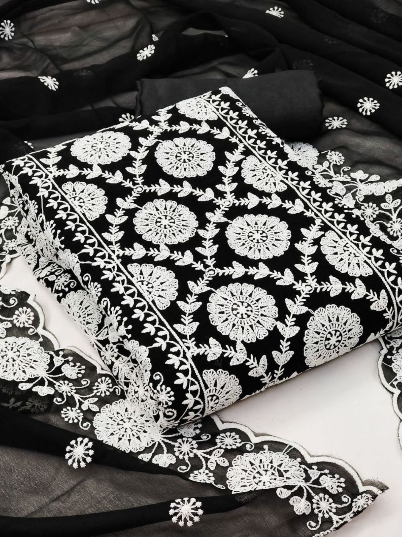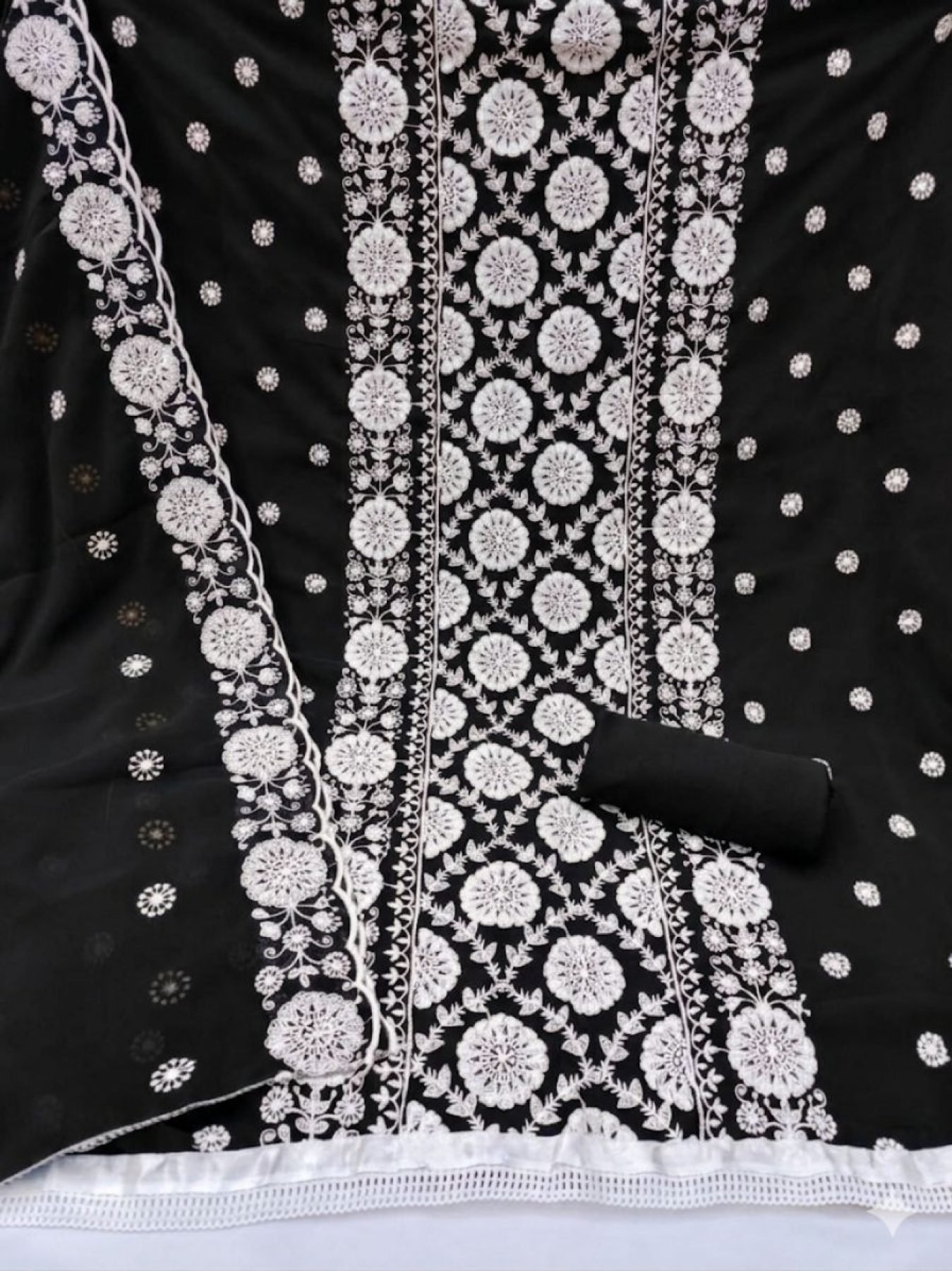 Affordable georgette dress material with cotton thread work top and dupatta, paired with crepe bottom. Ideal for daily and casual ethnic wear.
